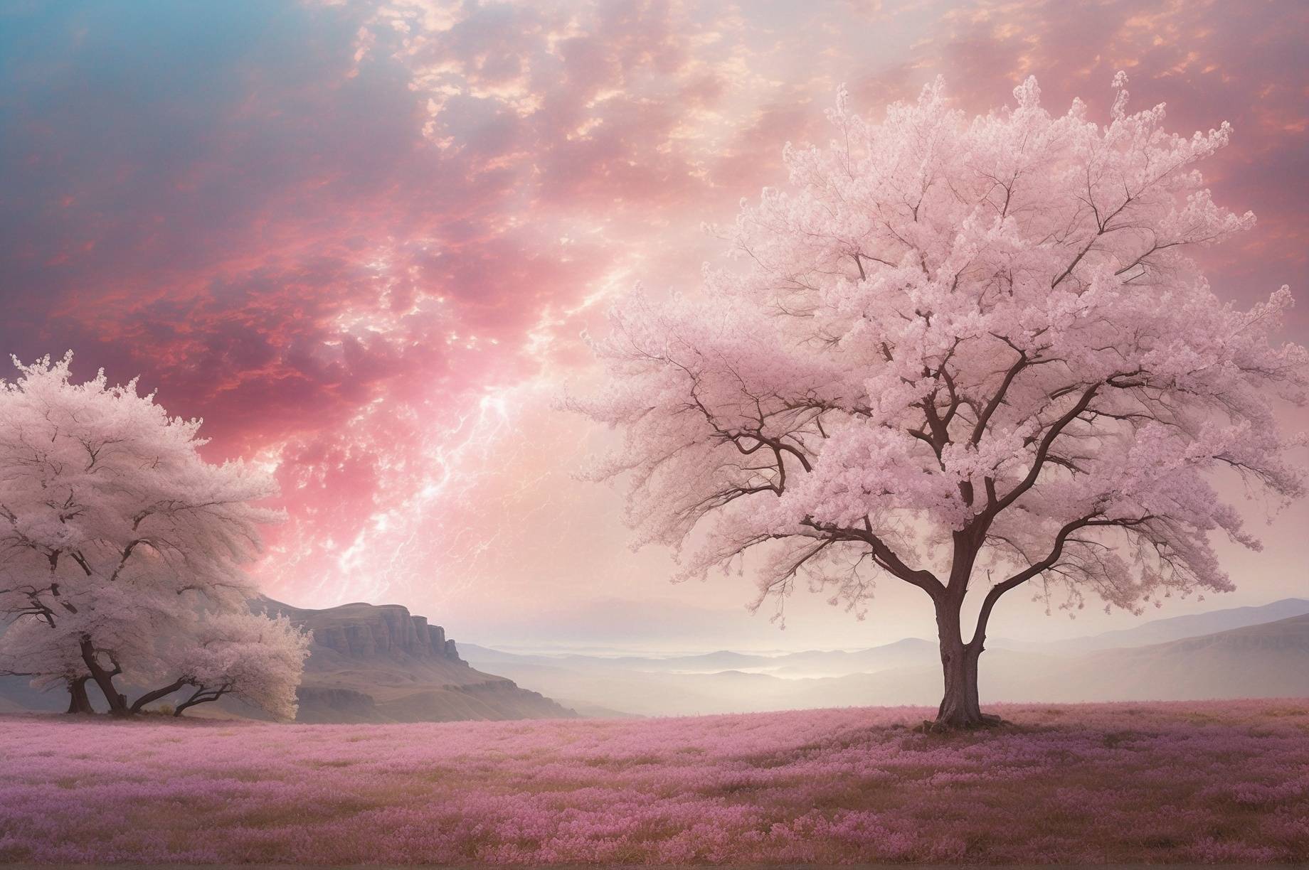 منظر سريالي يحتوي على عناصر من CosmicLumina وSkyDancer، يظهر ألواناً نابضة وجوًا م ethereal.