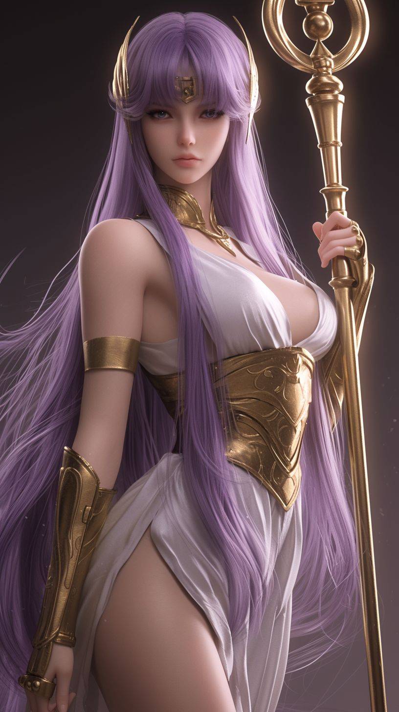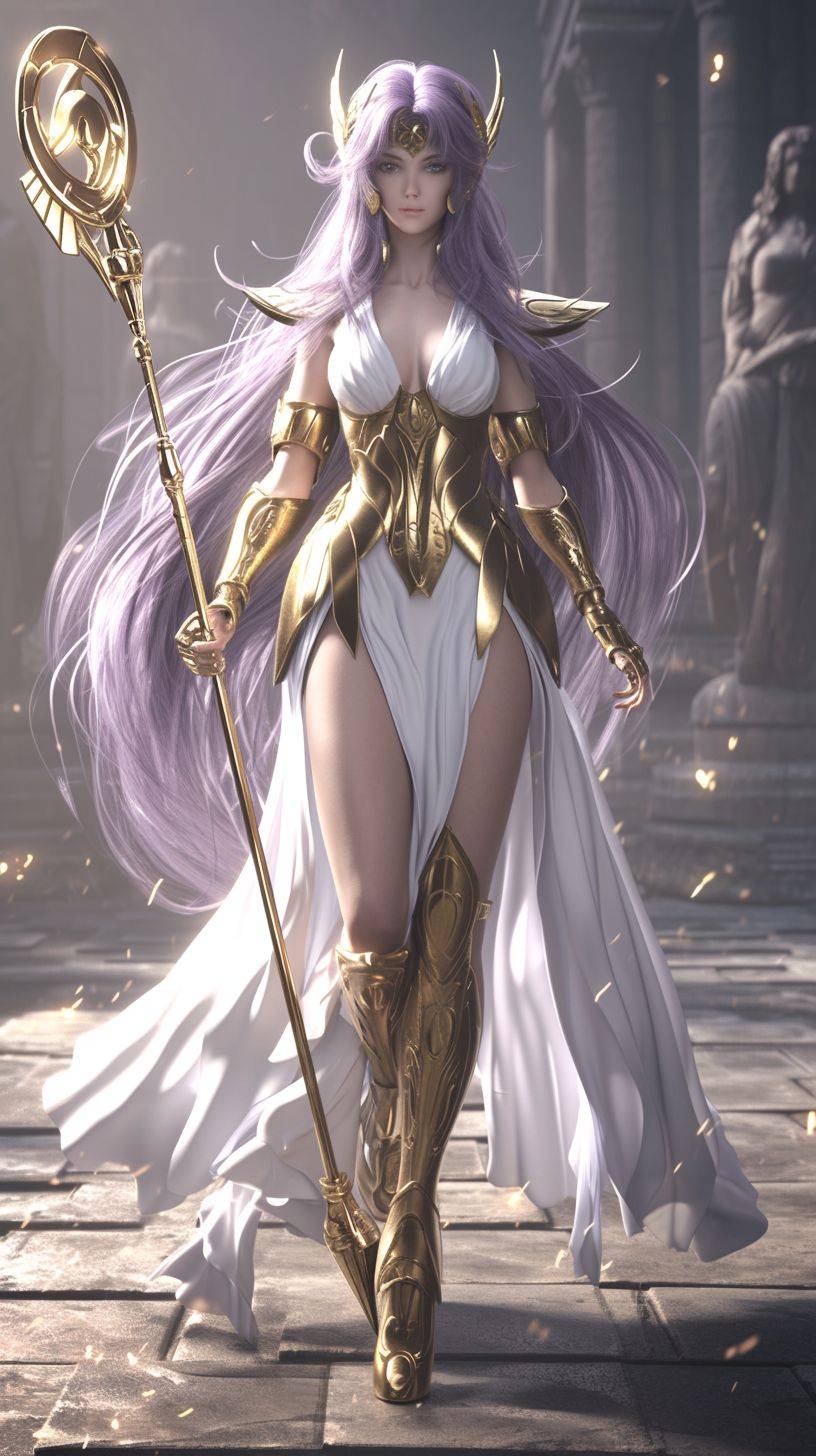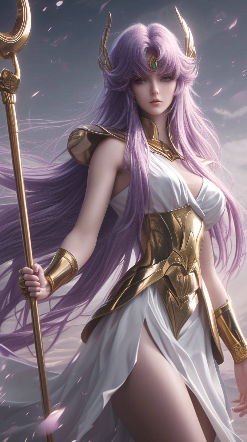 Saori Kido Athena [with a golden sceptre, long violet hair and white tunic], in the style of hajime sorayama, anime art, Saint Seiya, epic, rtx on, daz3d, animated illustrations, foreshortening techniques, sharp angles, vibrant manga, japanese-inspired --ar 9:16 --niji 6 --style raw --stylize 1000
