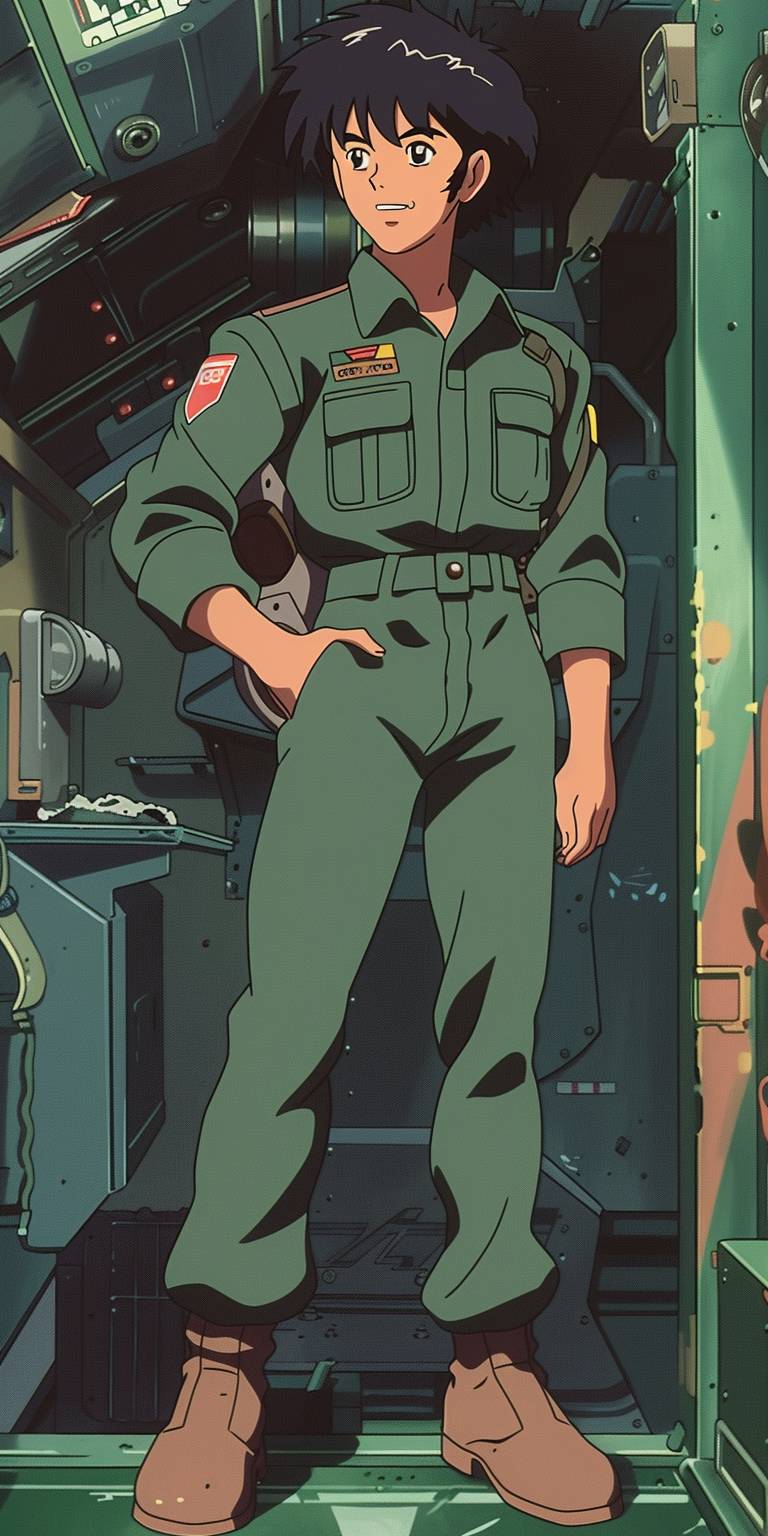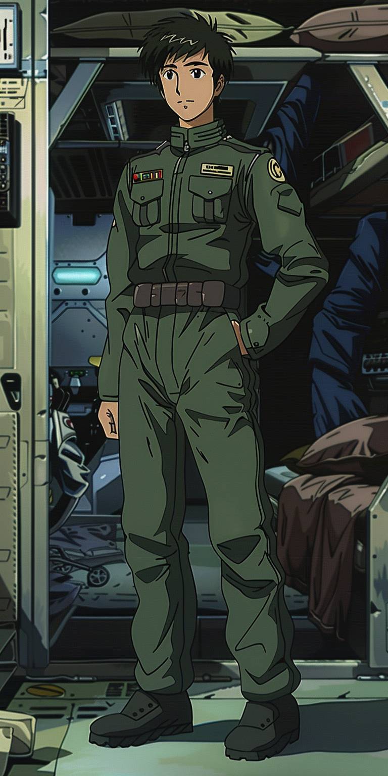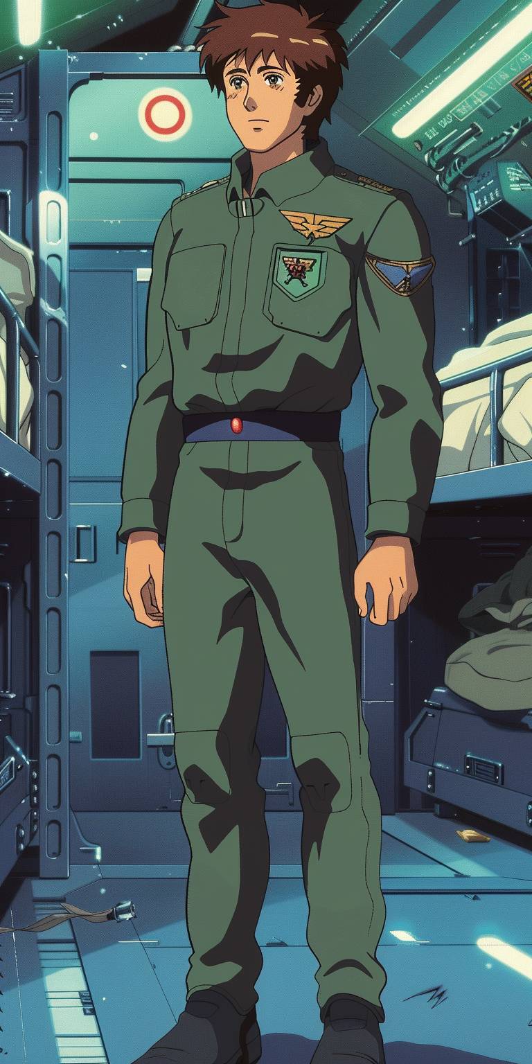 شاب لاتيني مراهق طيار من مسلسل Mobile Suit Gundam 0083 في الثمانينيات، بشعر قصير يرتدي زي EFSF داخل غرفة نوم.