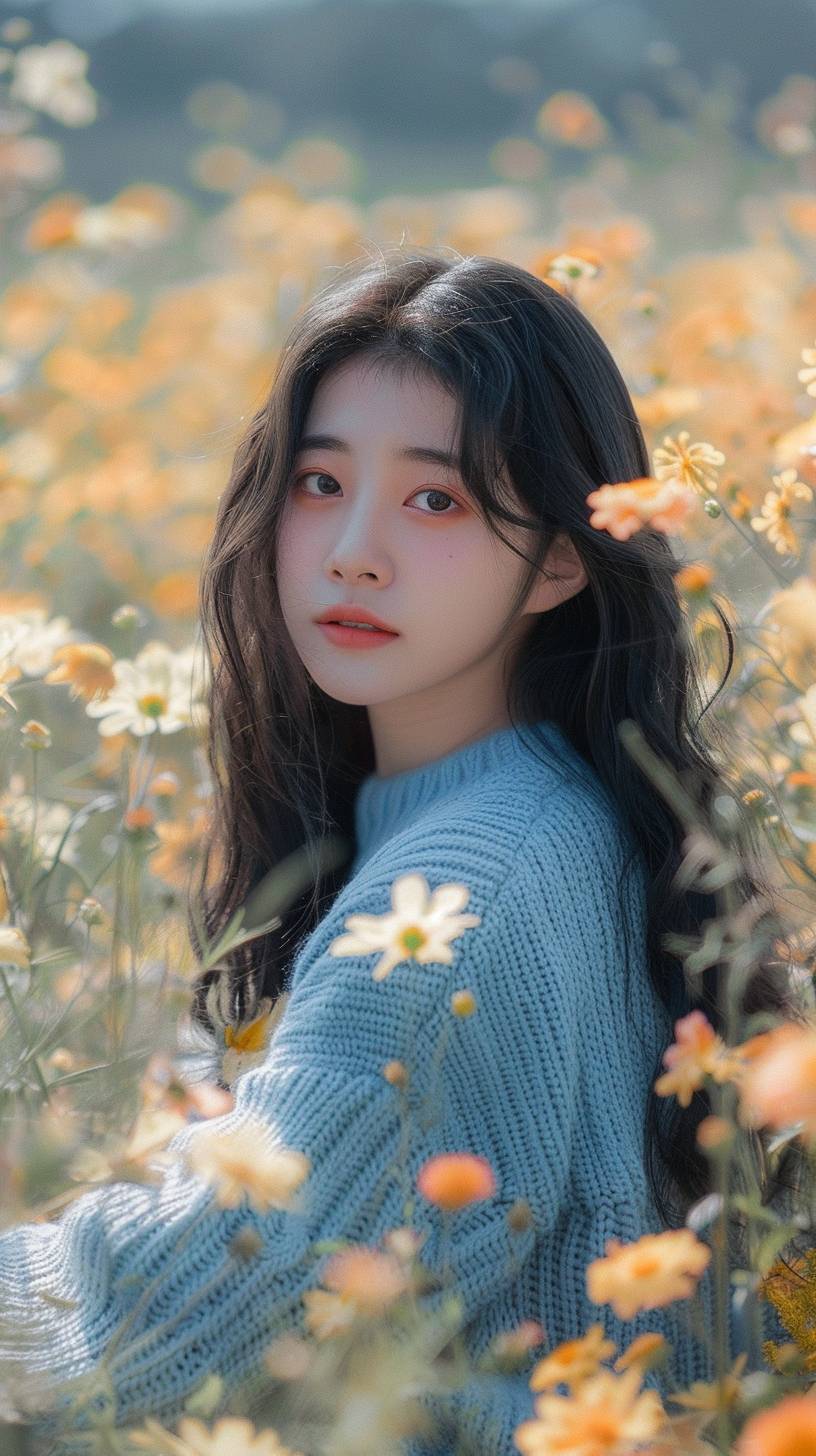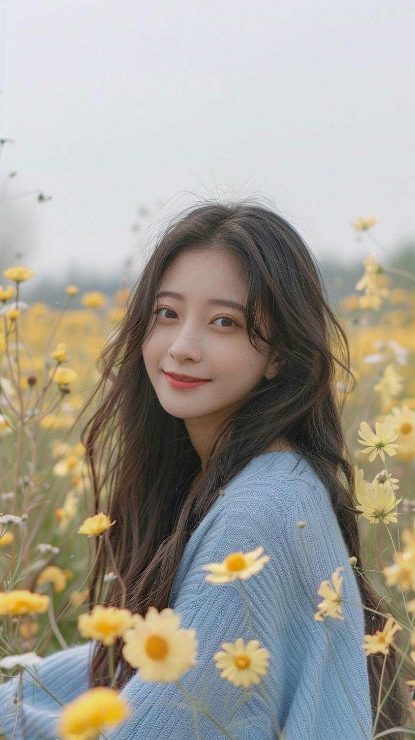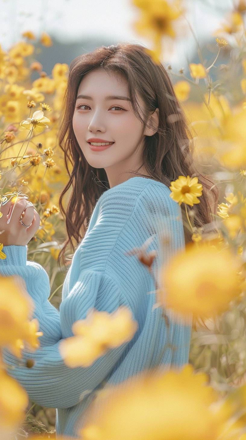 Chinese girl with light makeup, Long hair, Light blue sweater, Smile, Lazy, Flower field, Yellowish, Spring, Japanese style refreshing, Mid-range --ar 9:16 --v 6.0