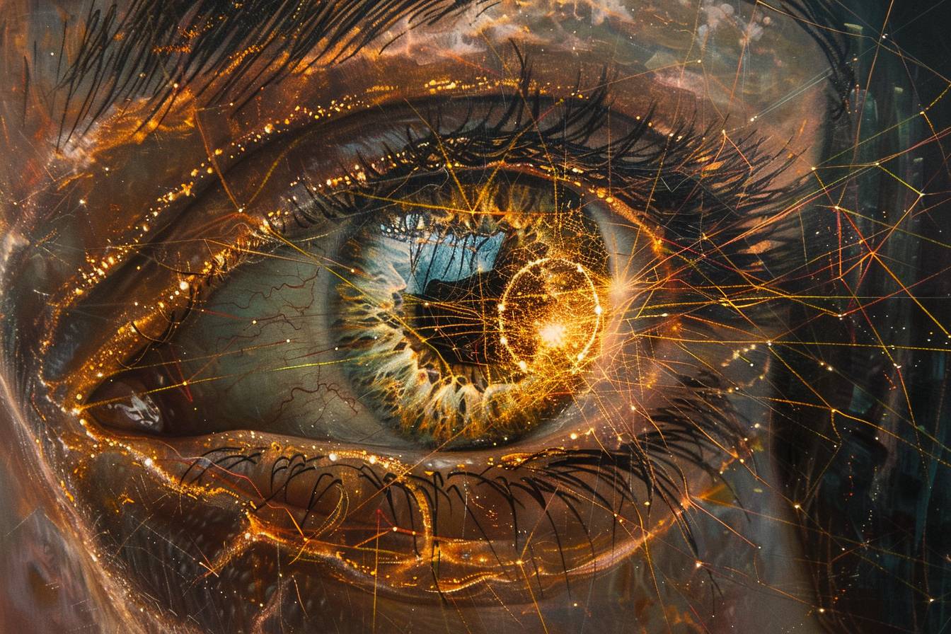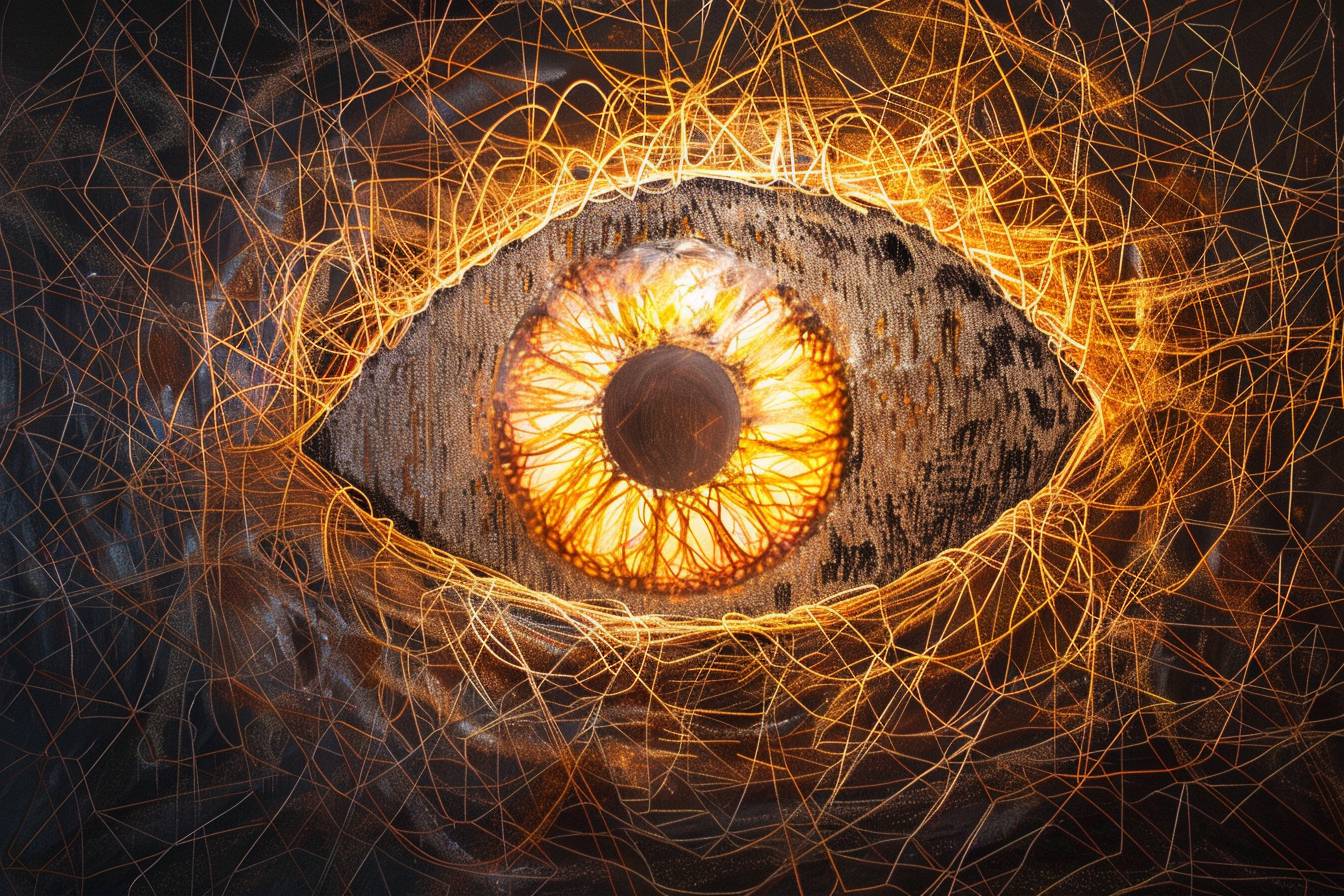 عمل فني سريالي لفن الخيط يميز orb يتلألأ ويت pulsates يمثل قزحية العين ذات اللون العسل، مع خيوط تبدو وكأنها تنبعث منها، تنسج نمطًا معقدًا من الأفكار والعواطف.
