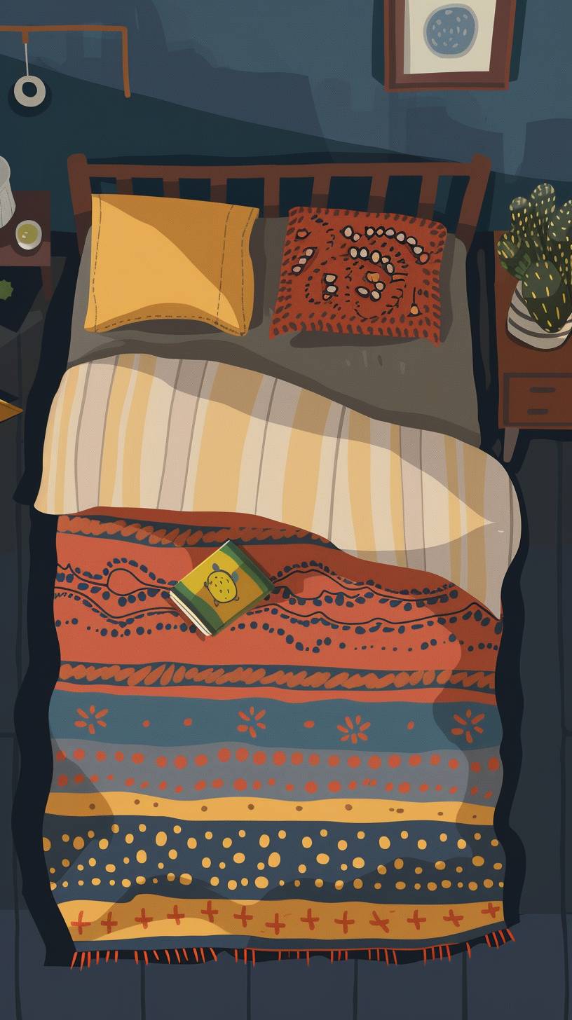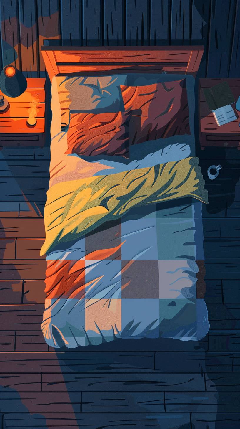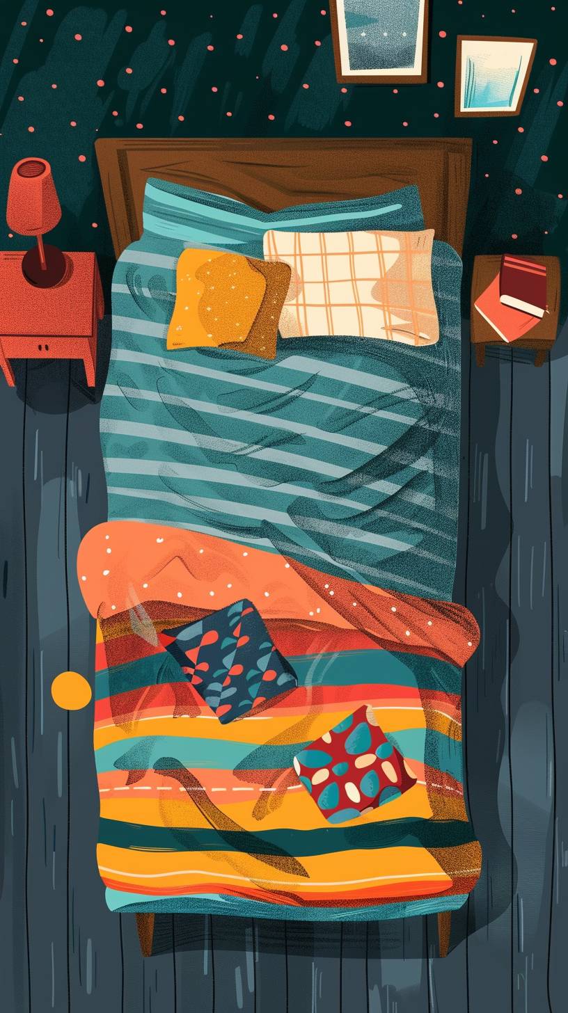 غرفة نوم مريحة، ليلاً، رسم توضيحي بسيط من الأعلى للسرير