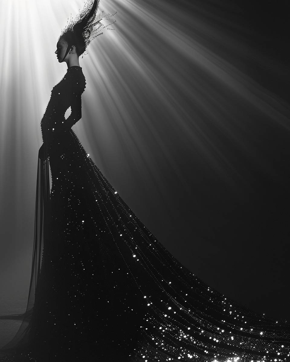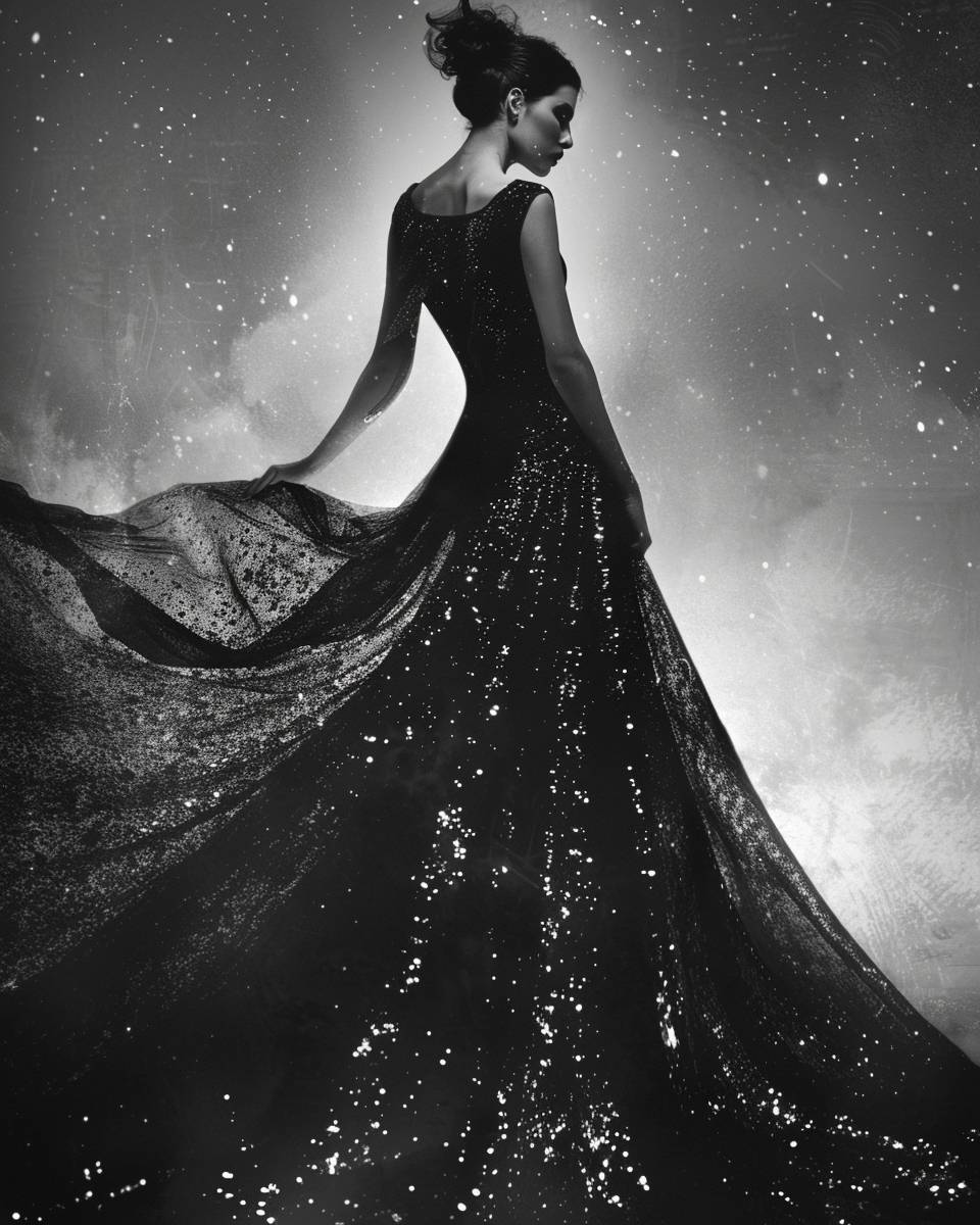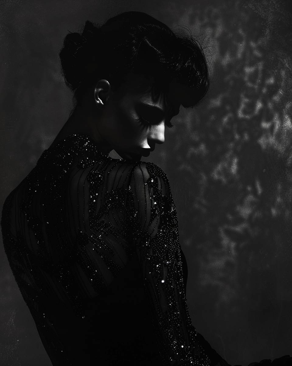 ObsidianElegance: Shimmering silhouette, high-gloss reflection. NoirNobility: Monochrome majesty, textured shadows. OnyxOde: Striking profile, gleaming black attire. MidnightMuse: Enigmatic presence, polished allure. --ar 4:5 --v 6.0