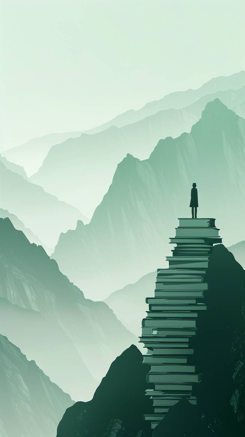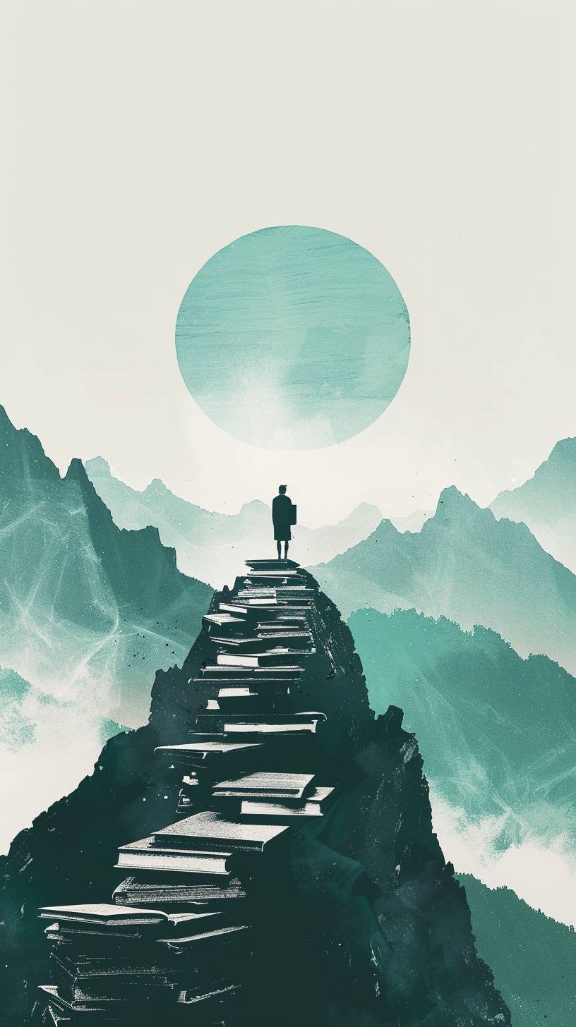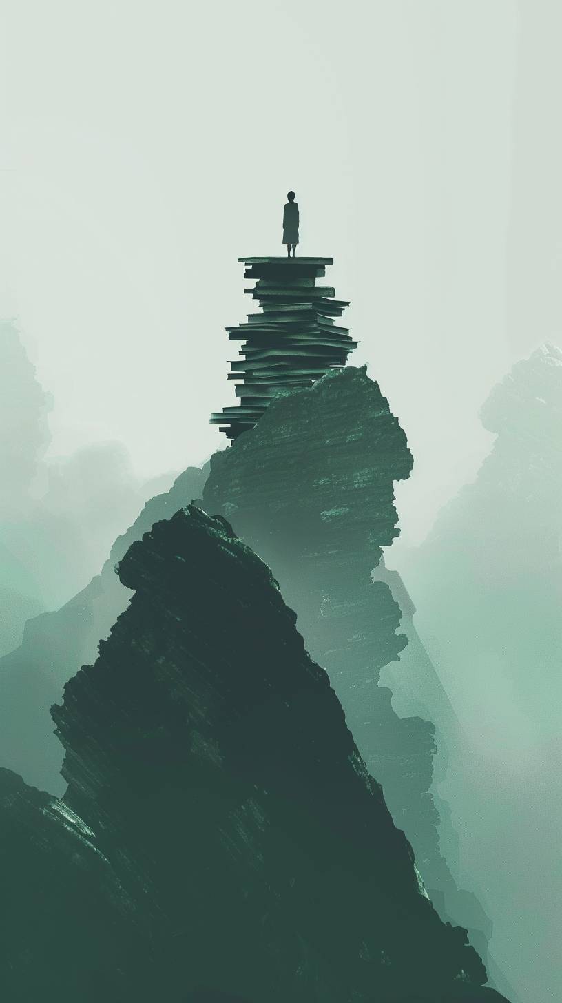 Minimalism, artistic conception, ink painting, a scholar, silhouette, standing on a mountain of stacked books, two mountains, Zhang Daqian style, modern art graphic illustration, perspective aesthetics, light green, soft gradient colors, ancient Chinese minimalist painting, figure, transparent background, depth of field, high definition, high resolution, ultra-high detail --ar 9:16 --v 6.0