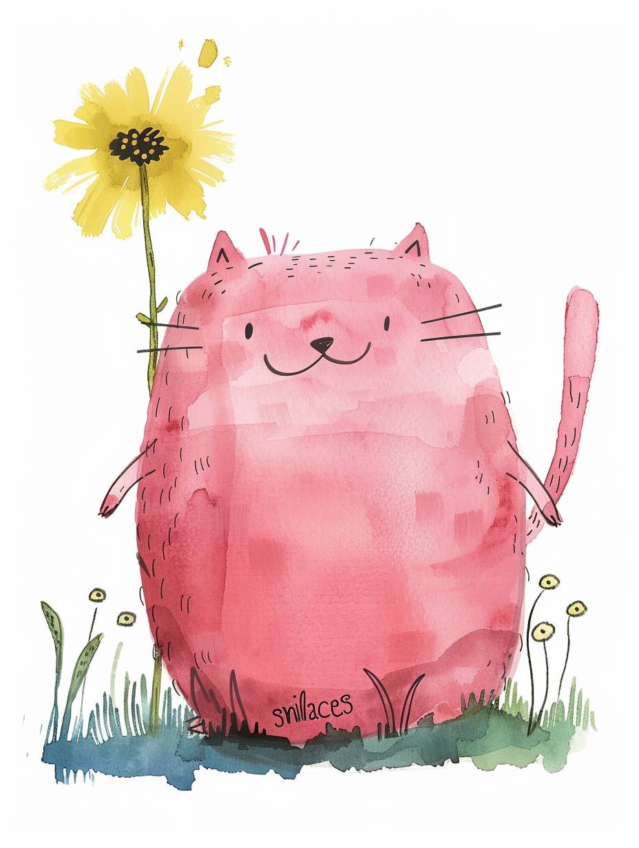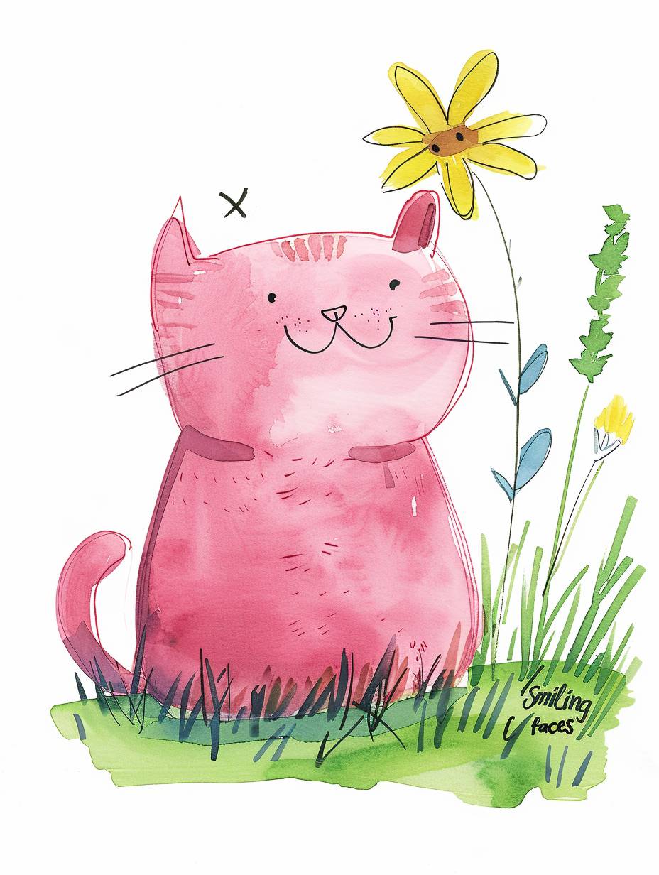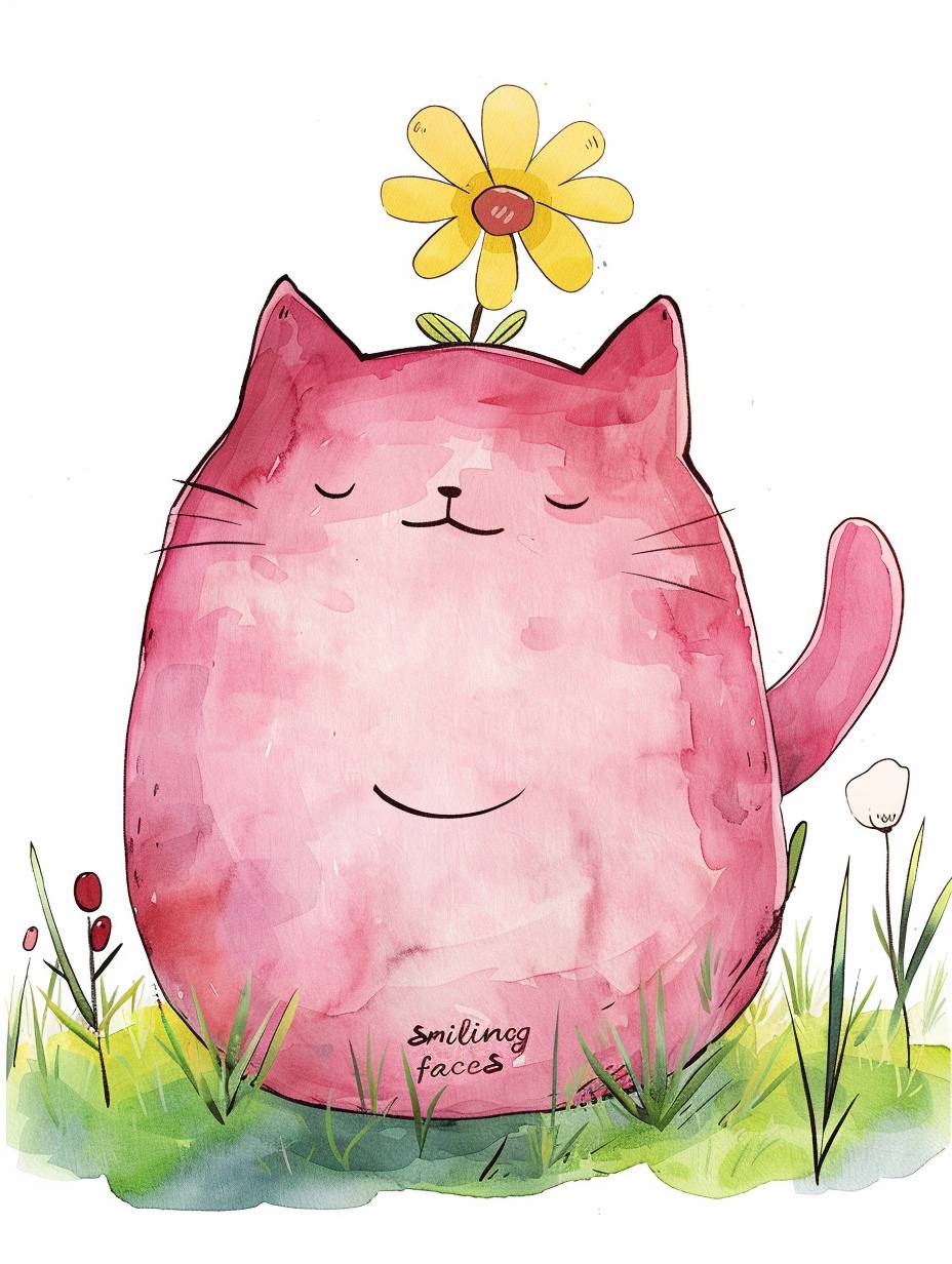 A cute pink cat with a yellow flower on its head, a chubby body, a simple doodle, a cartoon character in the style of L Round with a minimalist illustrator style, a playful and cheerful illustration, using an ink wash technique, bold lines, a clean white background, a colorful Moebius, using watercolor techniques to create a happy face, a fat body with a big belly, standing in a grassy field, isolated, text "smiling faces" on the bottom of its body, isolated. --ar 3:4 --v 6.0