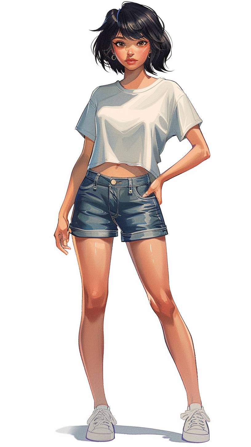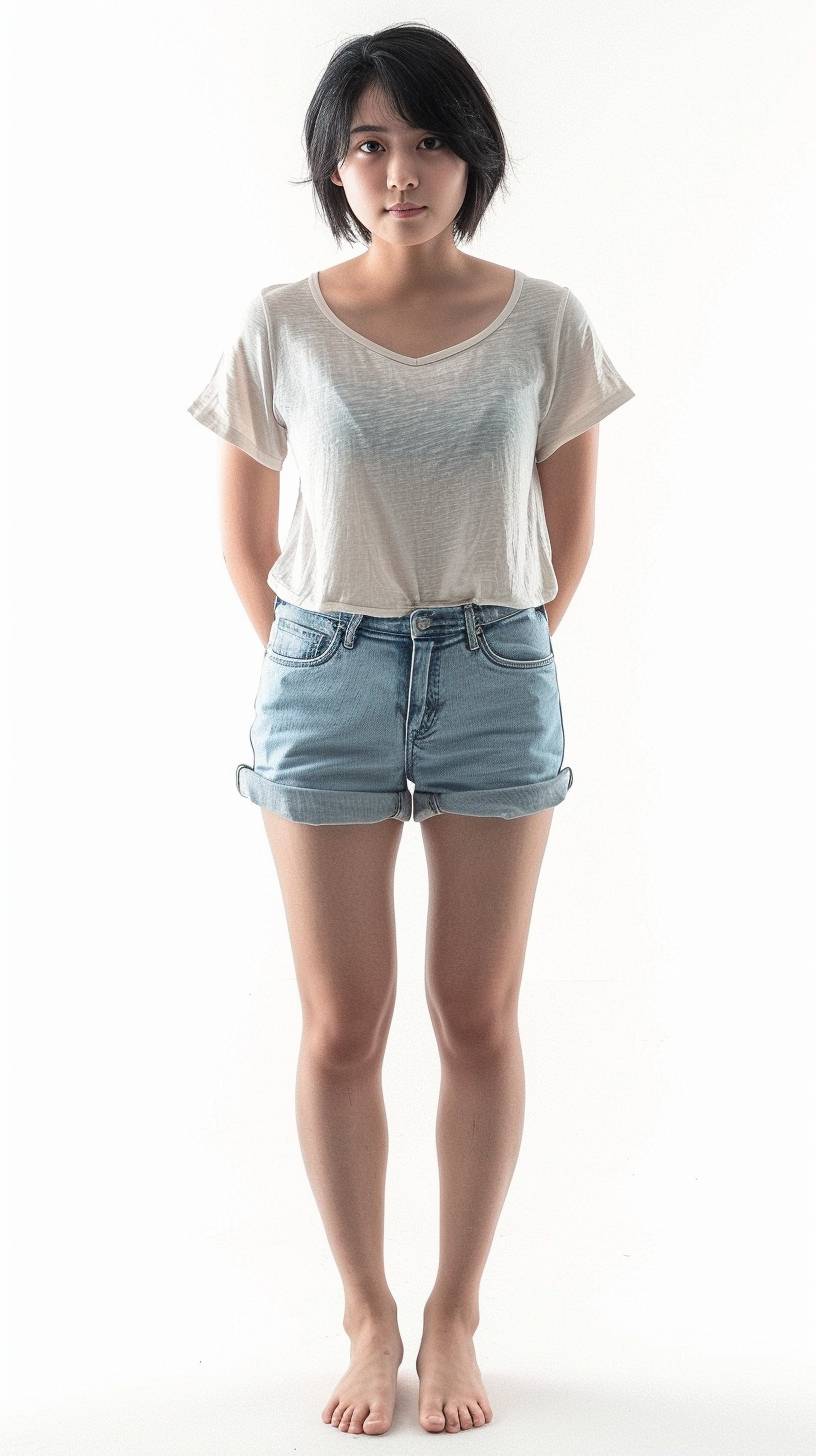 plaintext A cute 17-year-old girl with short black hair, wearing a t-shirt and denim shorts, full body including toes, against a white background --ar 9:16 --style raw --v 6.0