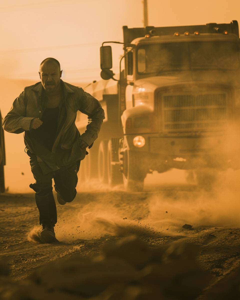 لقطة فيلم أكشن 35 مم، صورة لوولتر وايت يجري في الصحراء مطاردًا بشاحنات مستقبلية في أرض قاحلة ما بعد الكارثة على نمط ماد ماكس، بزاوية منخفضة، أجواء داكنة مصورة باستخدام سيناستيل 50D بواسطة جورج ميلر.