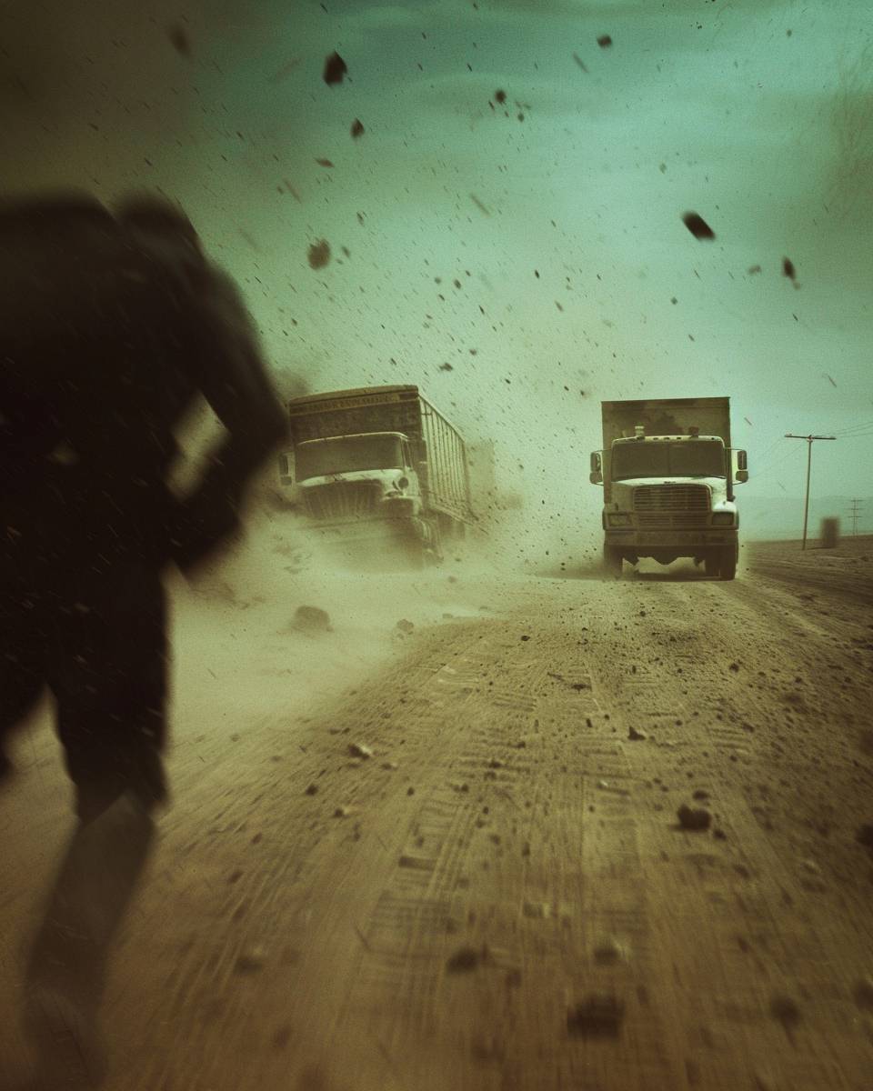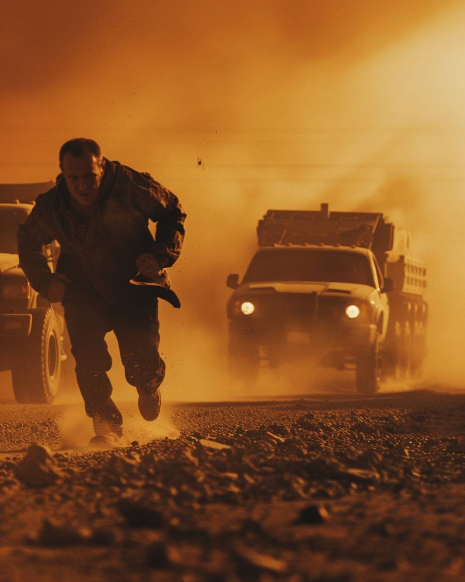35mm action movie still , photo of Walter White running in the desert chased by futuristic trucks in a Mad Max post-apocalyptic wasteland in the style of Mad Max , low angle, dark atmosphere shot with cinestilll 50d by George Miller --ar 4:5 --s 50 --p yfbxsj7 --v 6.0