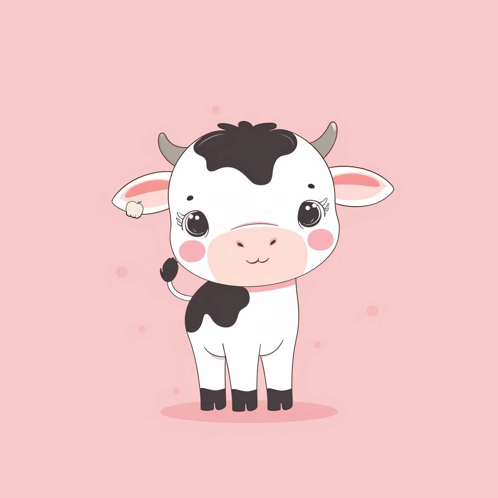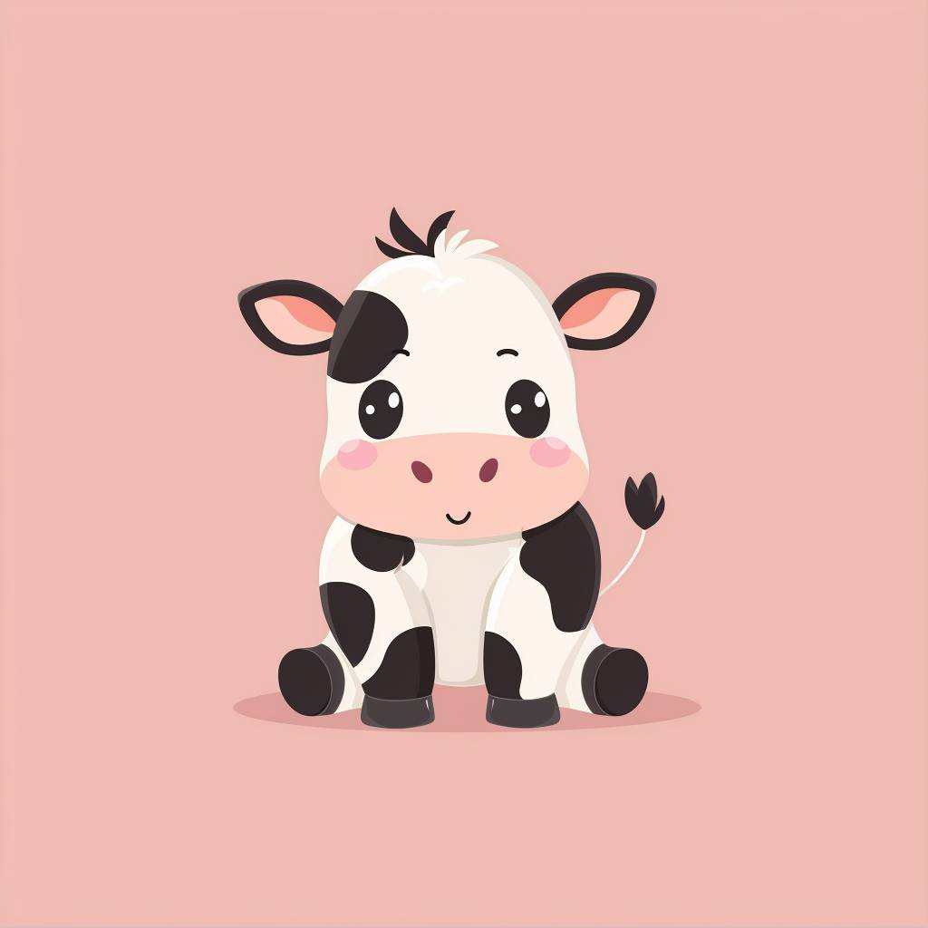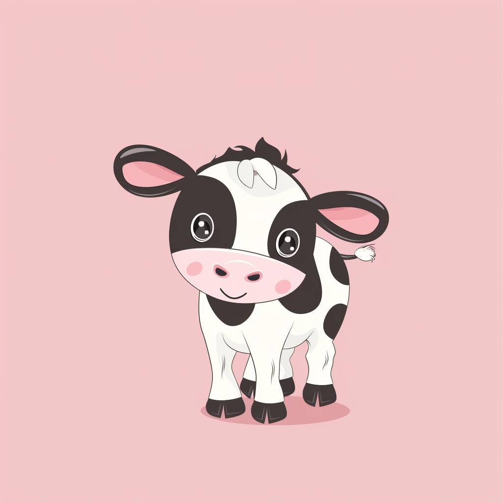 A cute baby cow in the style of Kawaii, all depicted as adorable characters against a soft pink background. The design is simple yet endearing, featuring clean lines and flat colors to capture an overall cheerful atmosphere. --ar 1:1 --v 6.0
