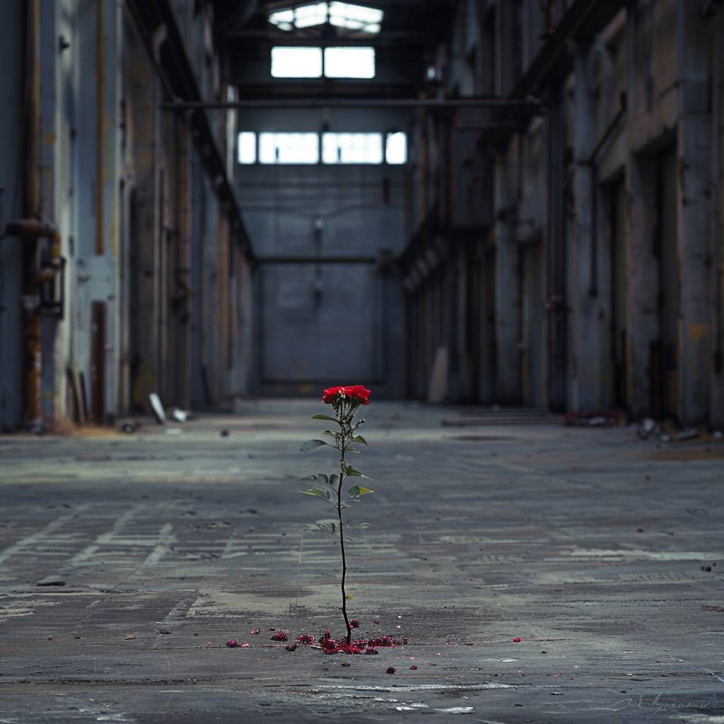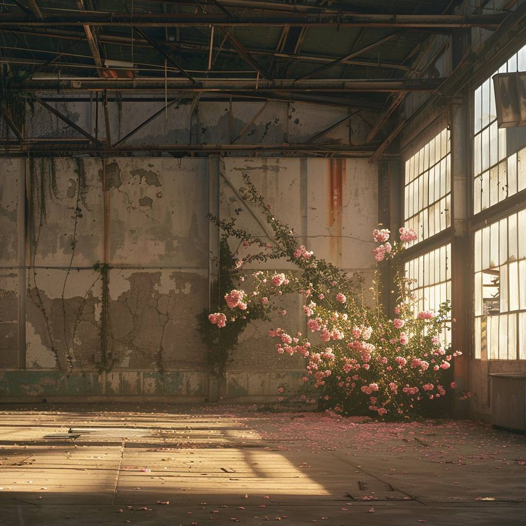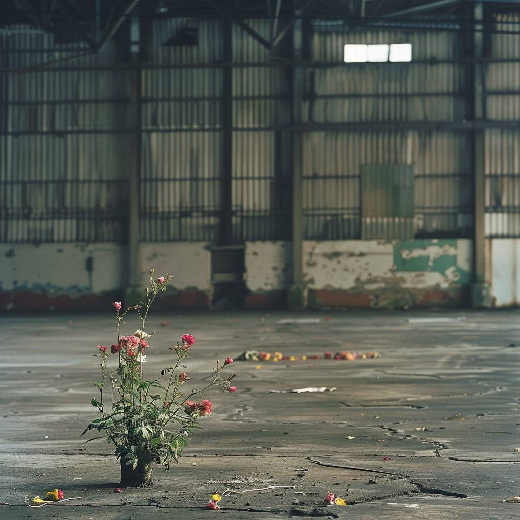 مخزن فارغ حيث تبدأ الزهور في التفتح من الخرسانة.