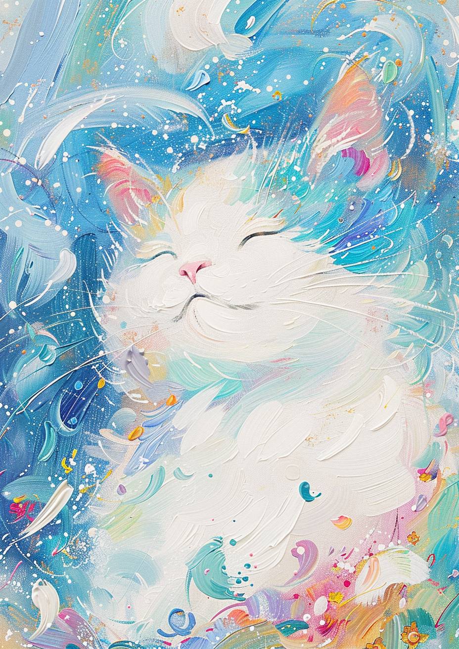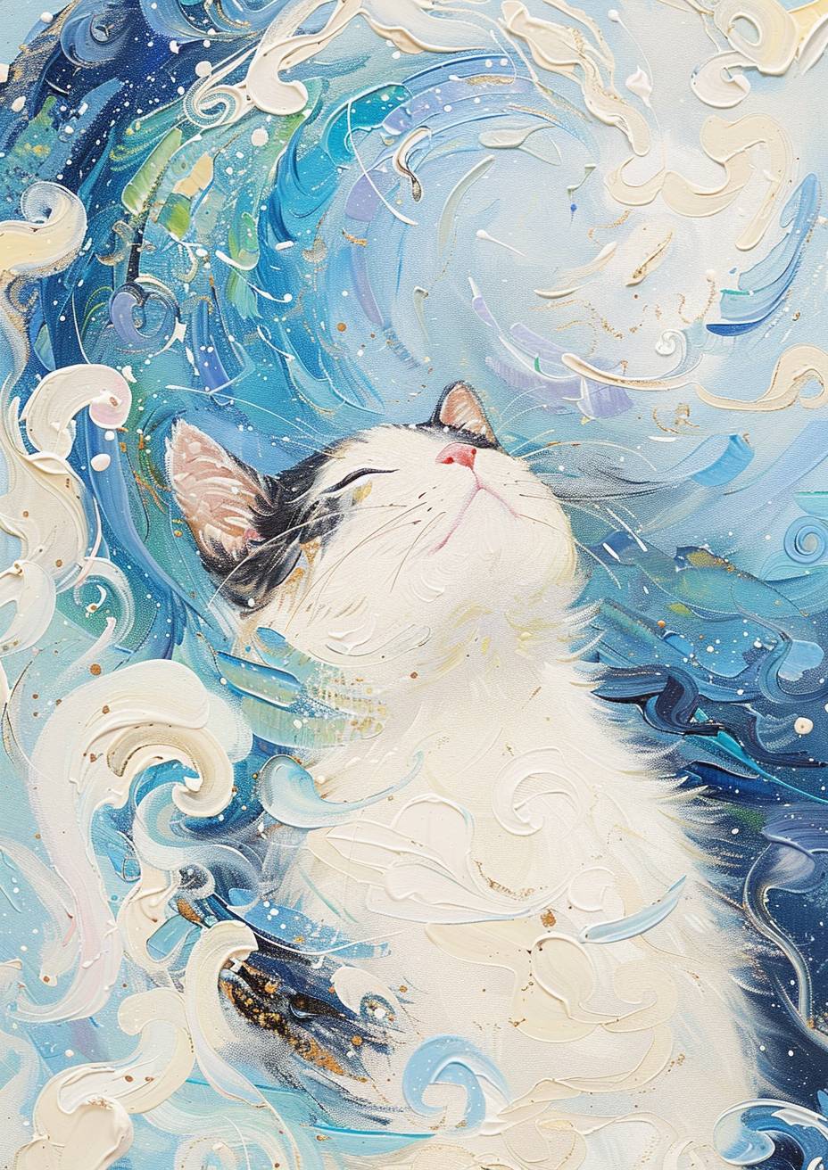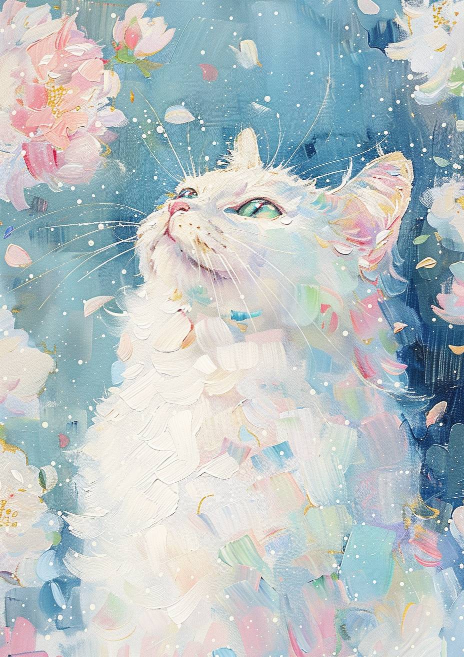 A lively cat depicted as a Dunhuang 'Feitian' (Flying Apsara) in ancient Buddhist art style, surrounded by colorful clouds and Galaxy of Stars, Soft lines. elegant and serene posture, expression of peace, eyes sparkling with wisdom. Oil painting, The color scheme of Monet's garden. Thickly painted oil painting, obvious oil brushstrokes. Full of creativity and aesthetic feeling. Minimalist. by Monet. UHD --ar 5:7 --personalize wgase9g --stylize 750 --v 6.0