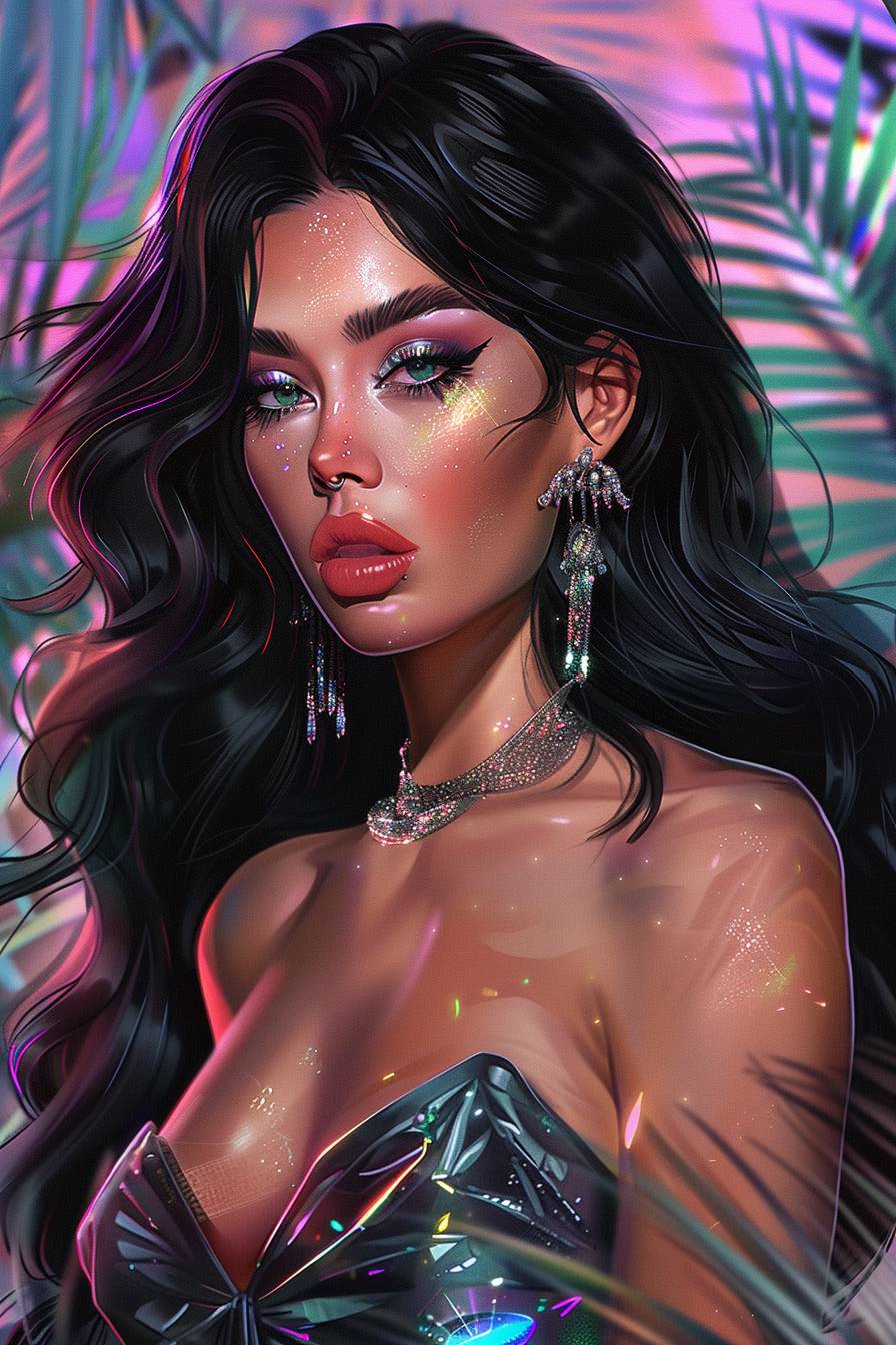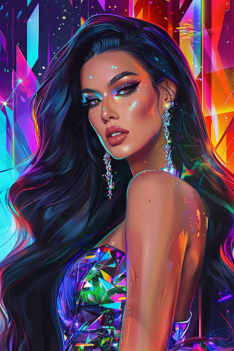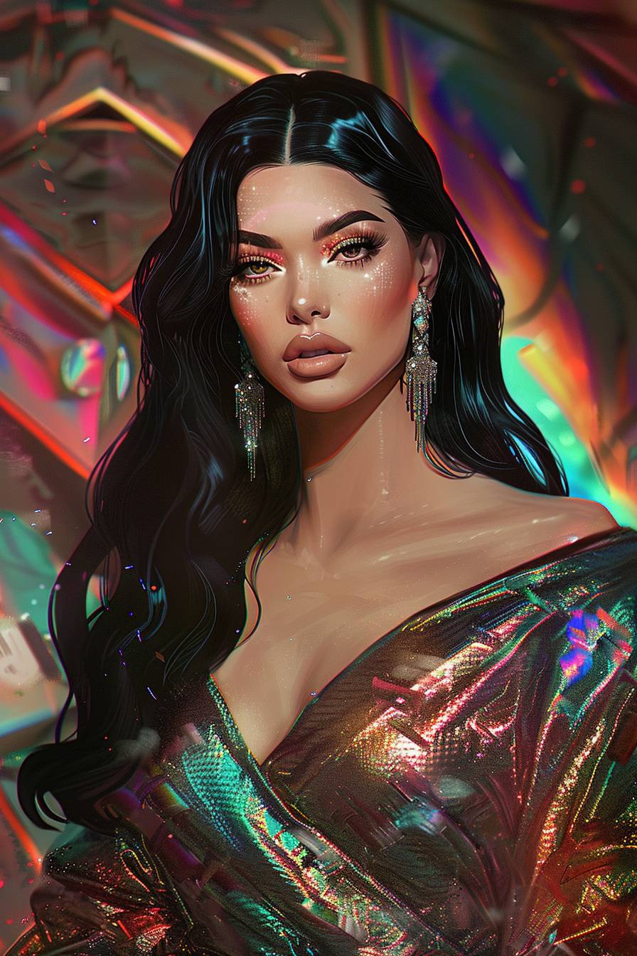A glamorous fictional Kardashian character, depicted in a vibrant and surreal art style. She has long, flowing, jet-black hair styled in loose waves. Her makeup is bold, with dramatic eyeliner, shimmering eyeshadow, and glossy lips. She's dressed in an extravagant, form-fitting gown made of shimmering, iridescent fabric that changes colors with movement. Her accessories include oversized diamond earrings and a statement necklace. The background is a luxurious setting with a modern, stylish twist, featuring abstract geometric shapes and rich, vivid colors. The overall ambiance exudes opulence and high fashion with a surreal, artistic touch. --ar 2:3 --v 6.0