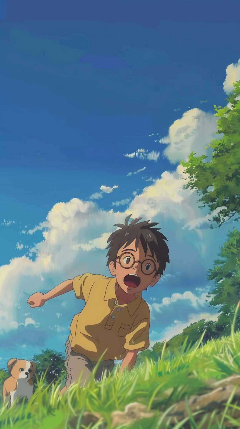 مشهد أنيميشن مرسوم يدويًا من إخراج هاياو ميازاكي، أنمي، ولد يرتدي نظارات يجري في حقل مع كلبه، الكلب هو تشاو تشاو أصفر، الولد يرتدي نظارات وقميص كبير، بأسلوب ستوديو جيبلي.