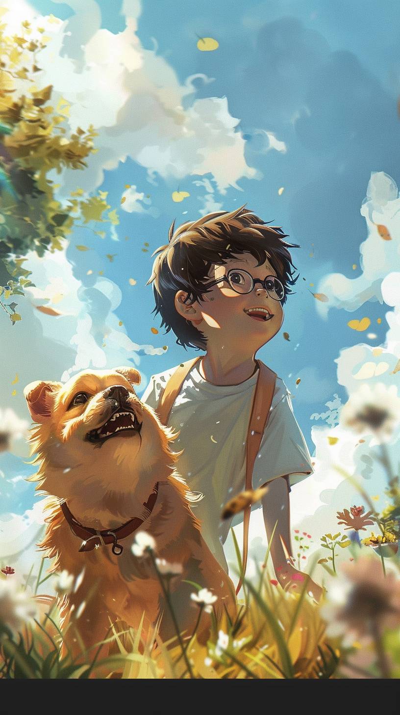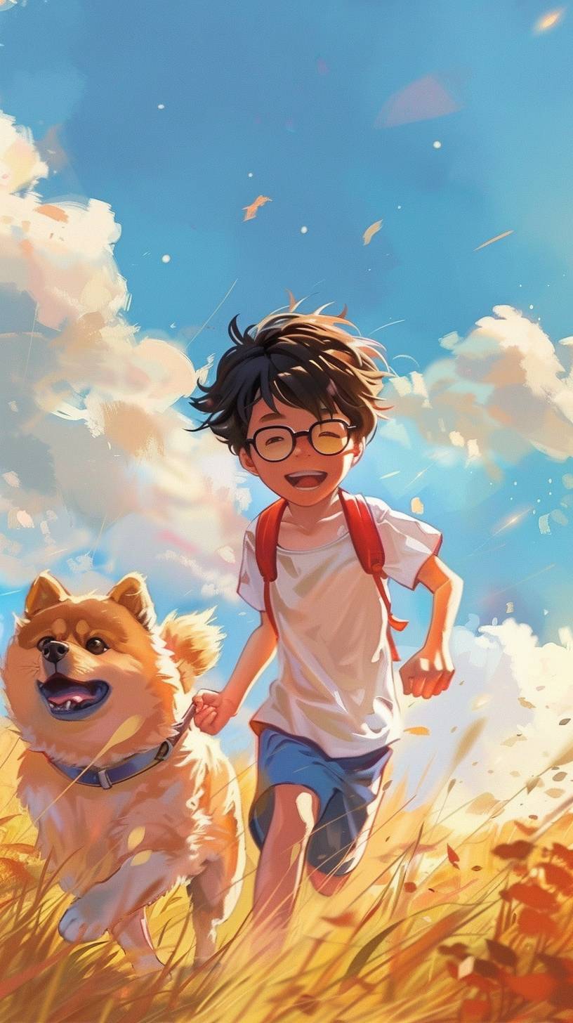 hand drawn animation scene directed by Hayao Miyazaki, anime, a boy with glasses with his dog running in a field, the dog is a yellow chow chow::1 , the boy wears glasses and a big shirt, in the style of Studio Ghibli,::1 --ar 9:16 --v 6.0