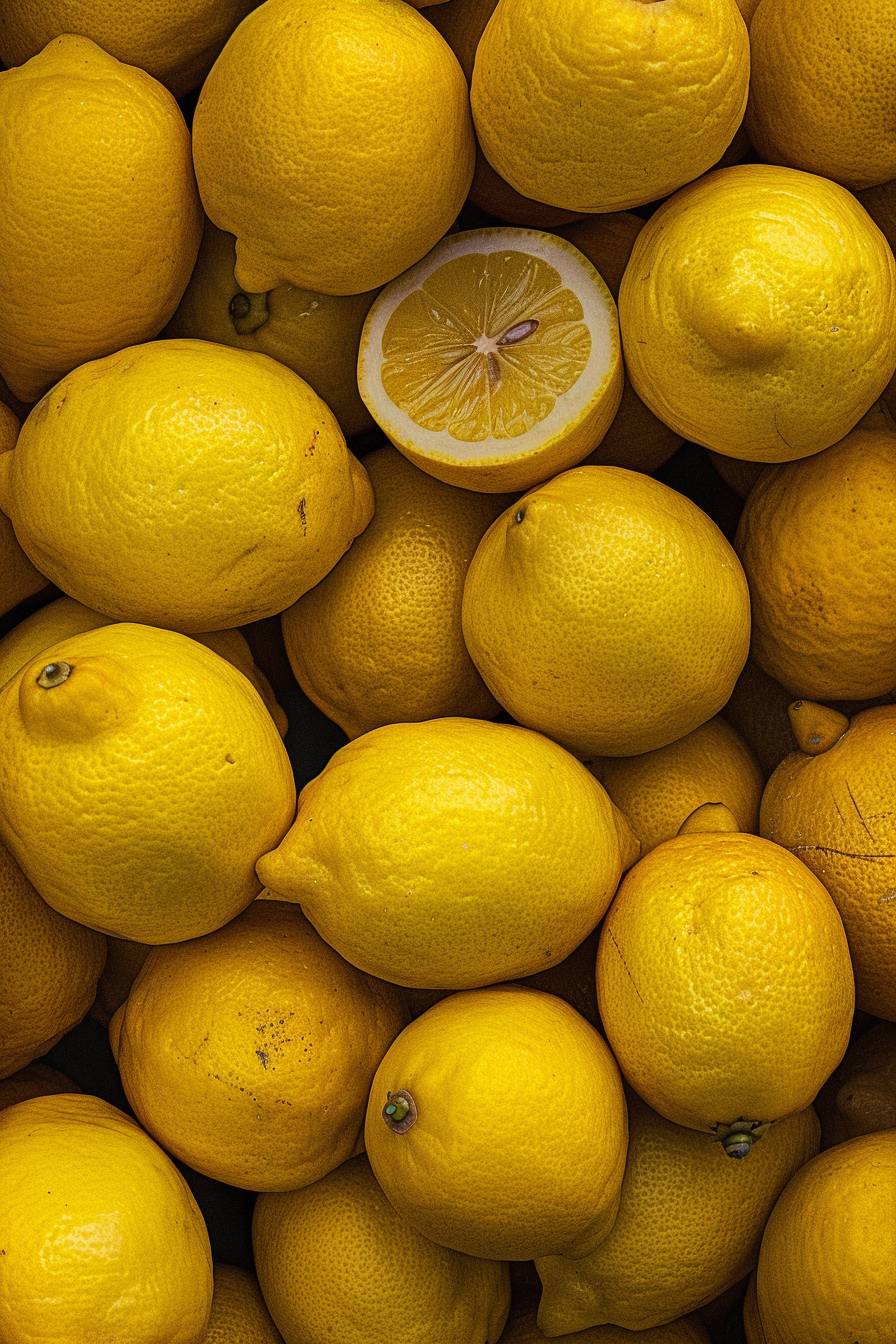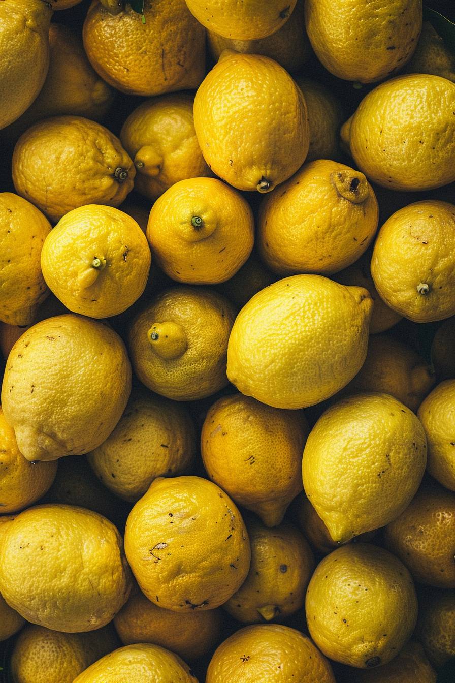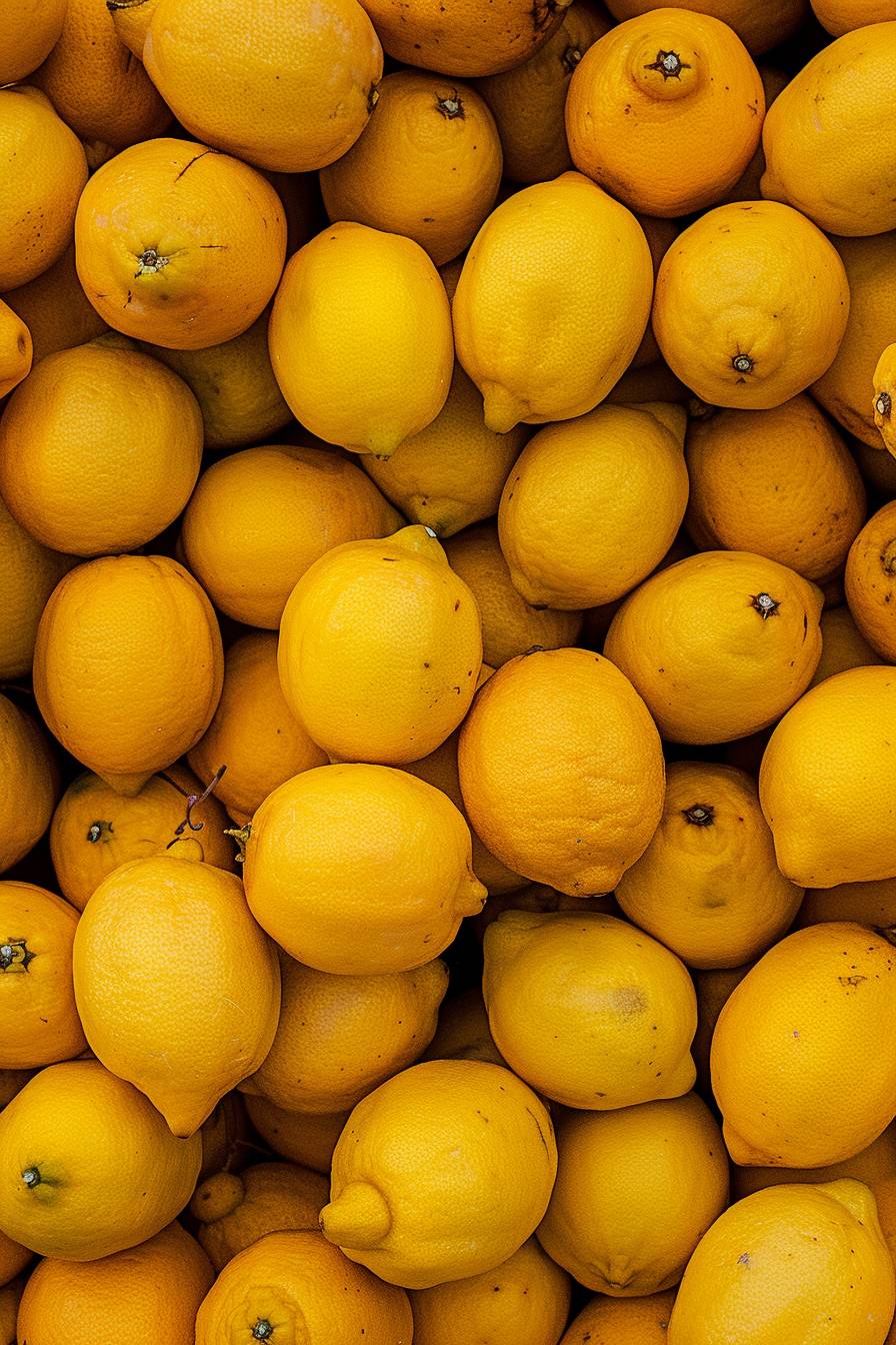 A pile of many lemons, fresh and juicy, bright neon yellow color, natural light, overhead shot, closeup, high resolution photography, rich in details, with clear focus and high definition, in the style of high quality --ar 2:3 --v 6.0