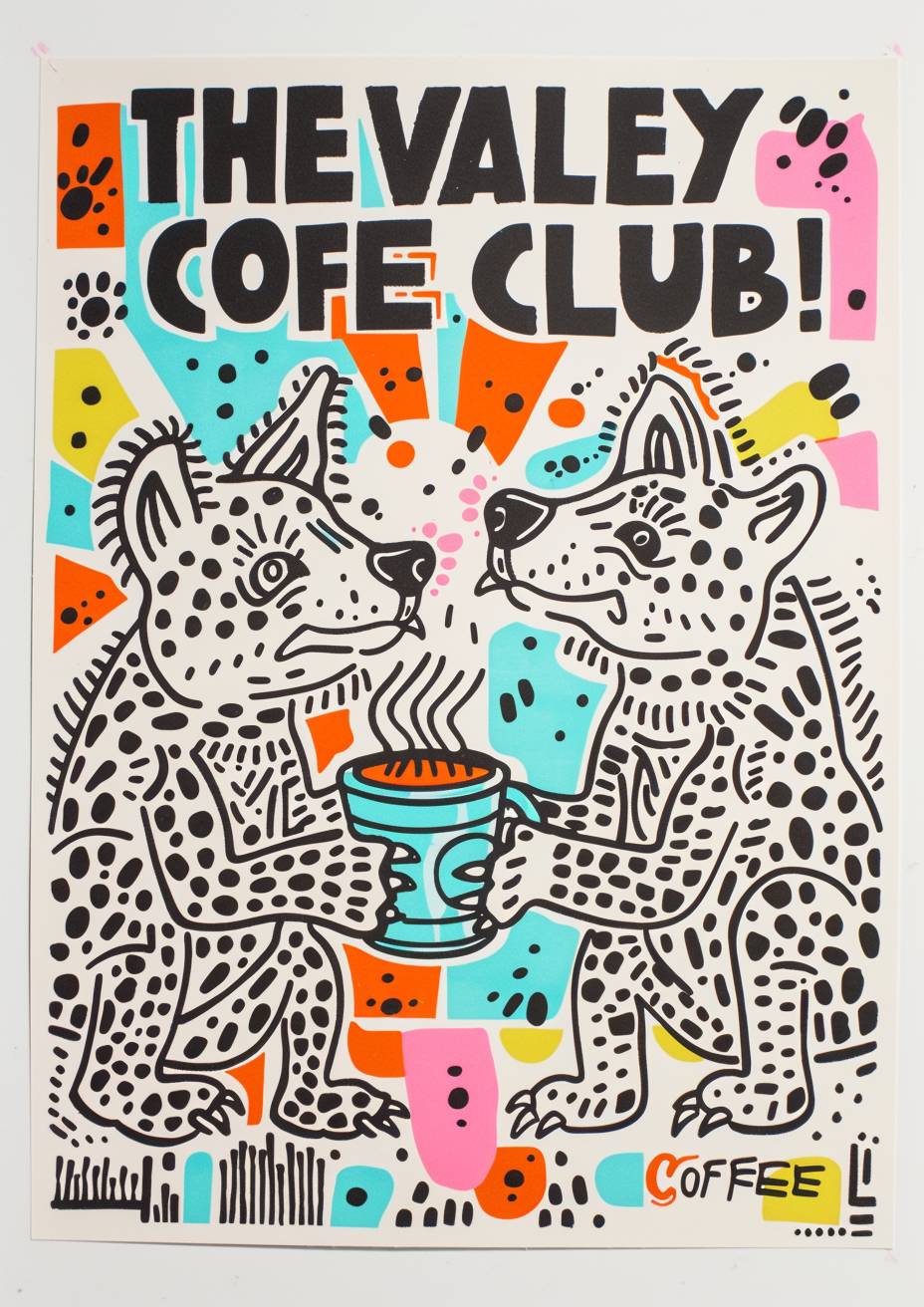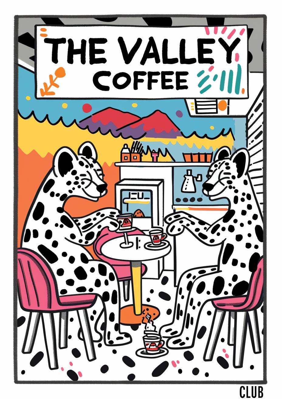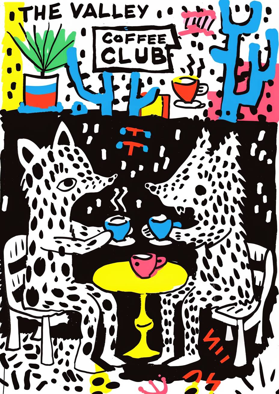 A simple drawing of spotted hyenas having coffee in the style of Keith Haring, black and white with bright colors, "THE VALLEY COFFEE CLUB" touch me! , text above the picture that says big cat factory. --ar 91:128 --style raw --stylize 50 --v 6.0