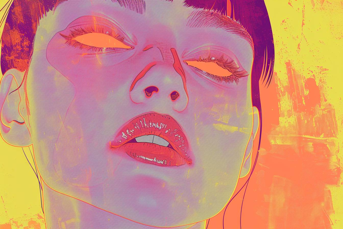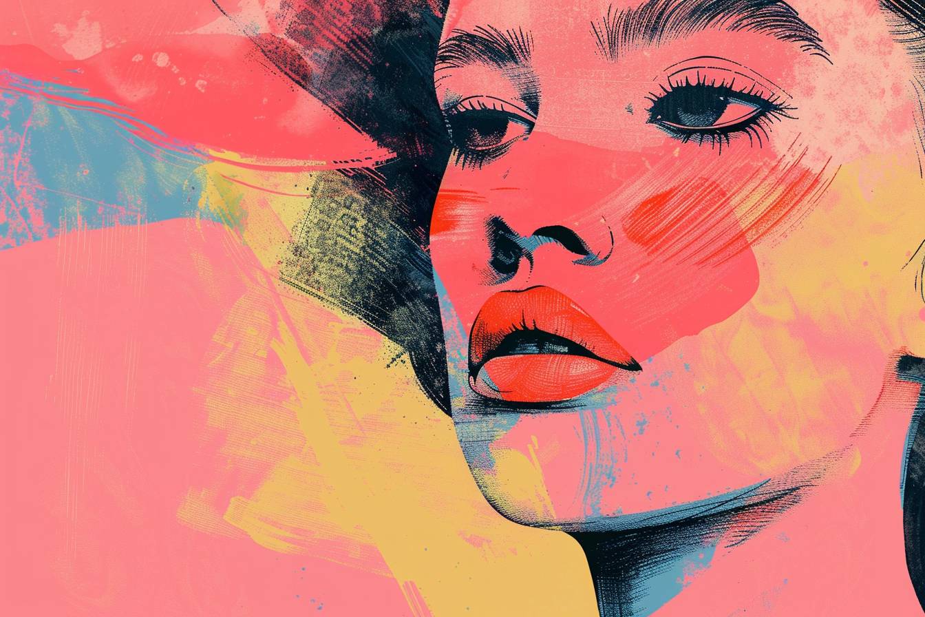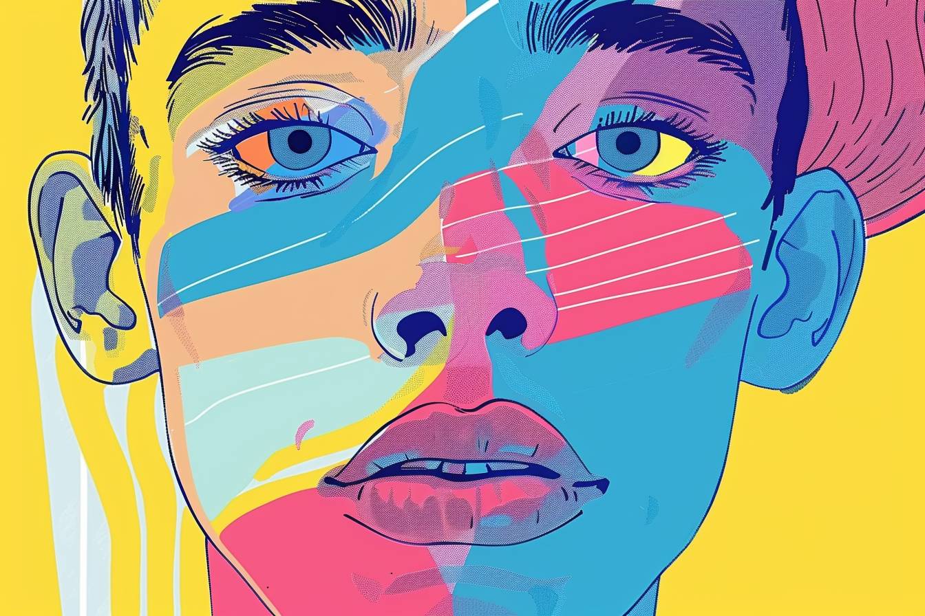 موضوع بأسلوب الفن الرقمي ، ألوان باهتة ، خلفية بسيطة ، رسومات مسطحة ، لقطة قريبة ، عرض أمامي ، شرائط كوميكس ، كولاج ، تجريبي