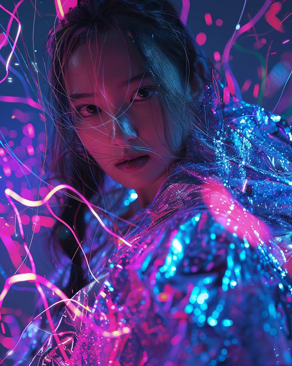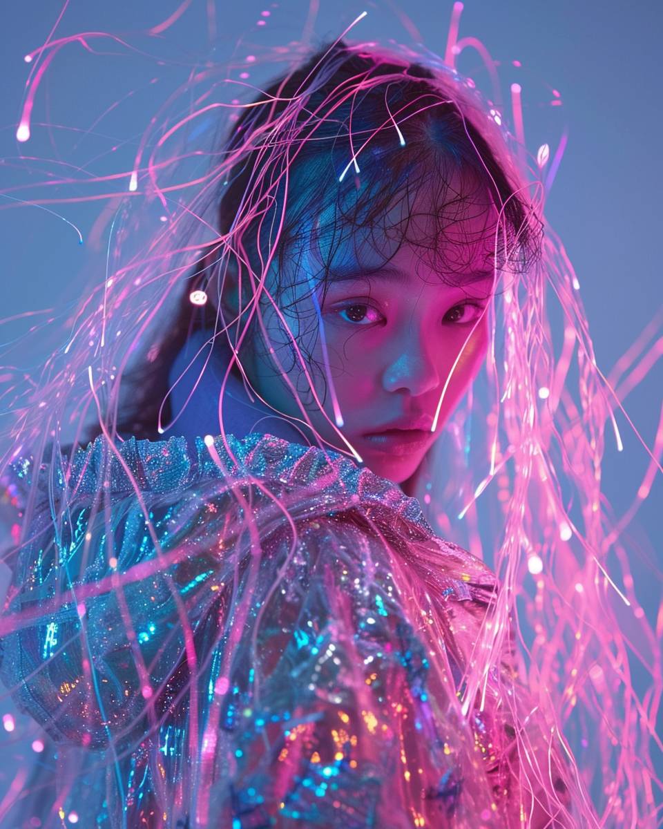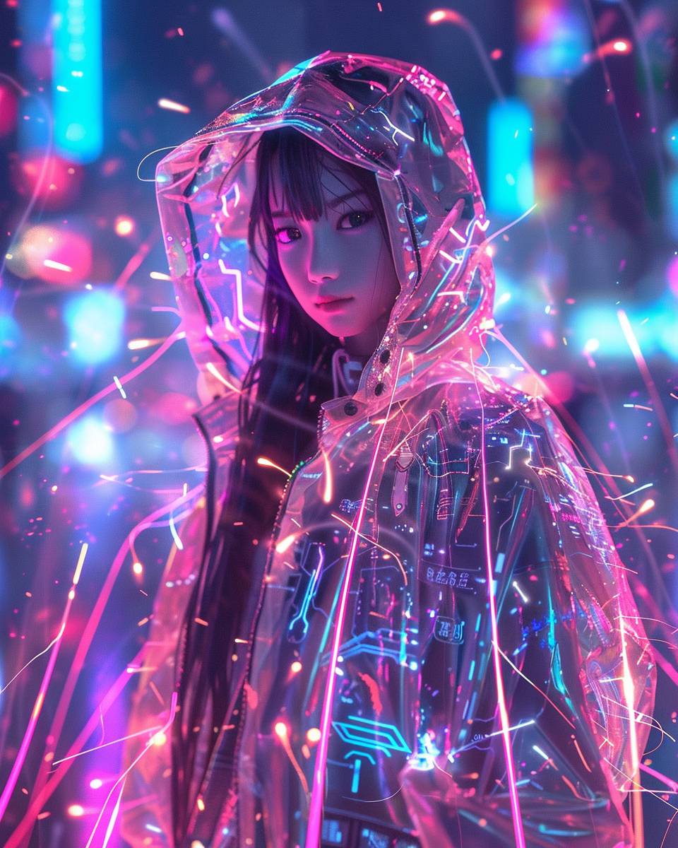 A young girl in a neon light cyberpunk outfit, covered with pink and blue glowing threads of energy and sparks flying around her. She is wearing an oversized jacket made from chrome material. She has long hair and looks into the camera in the style of anime --ar 4:5 --style raw --v 6.0