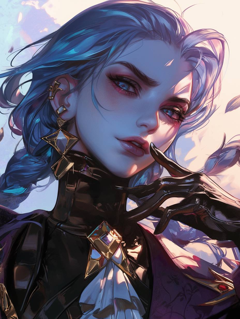 league of Legends Arcane Jinx in the style of rococo with elegant and ornate details, gold accents and pastel color, realistic --ar 3:4 --niji 6