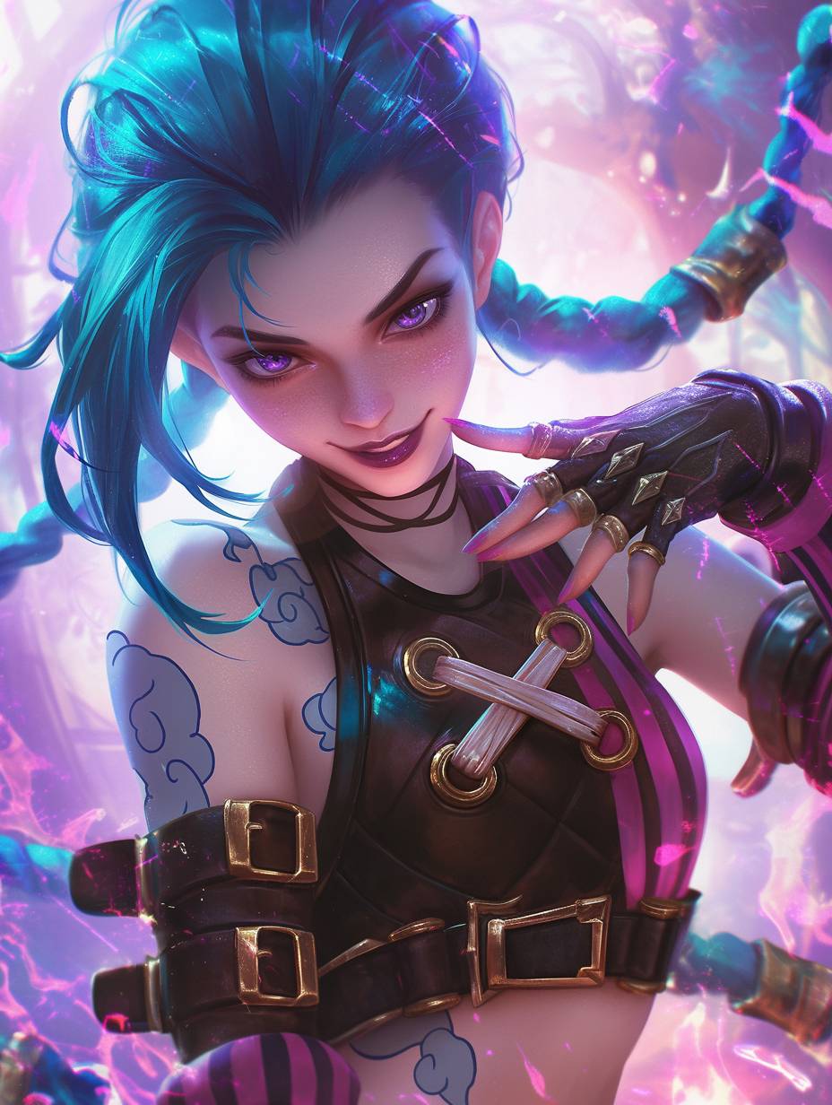 جينكس من لعبة ليج أوف ليجيندز بأسلوب الروكوكو مع تفاصيل أنيقة وزخرفية، لمسات ذهبية وألوان باستيلية، واقعية.