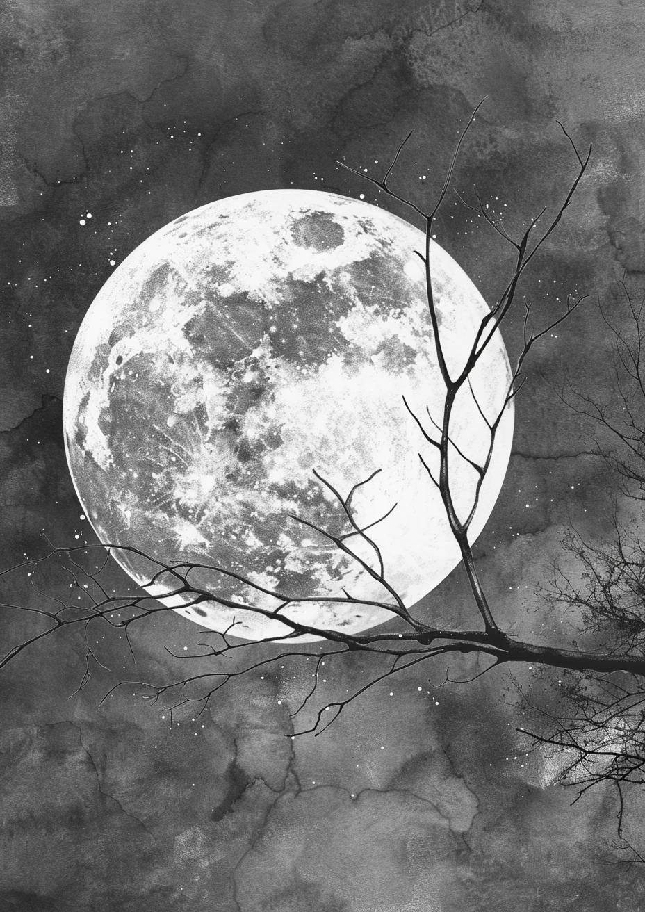 line drawing, sketch full moon with twigs branches overlapping moon on watercolor black and gray background with small twinkle stars in background --ar 5:7 --v 6.0