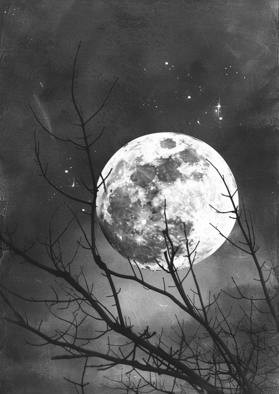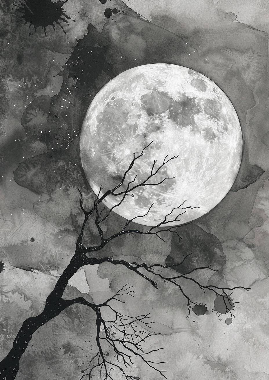 رسم خطي لهلال مكتمل مع أغصان تتداخل مع القمر ، على خلفية مائية رمادية وسوداء مع نجوم صغيرة تلمع في الخلفية.
