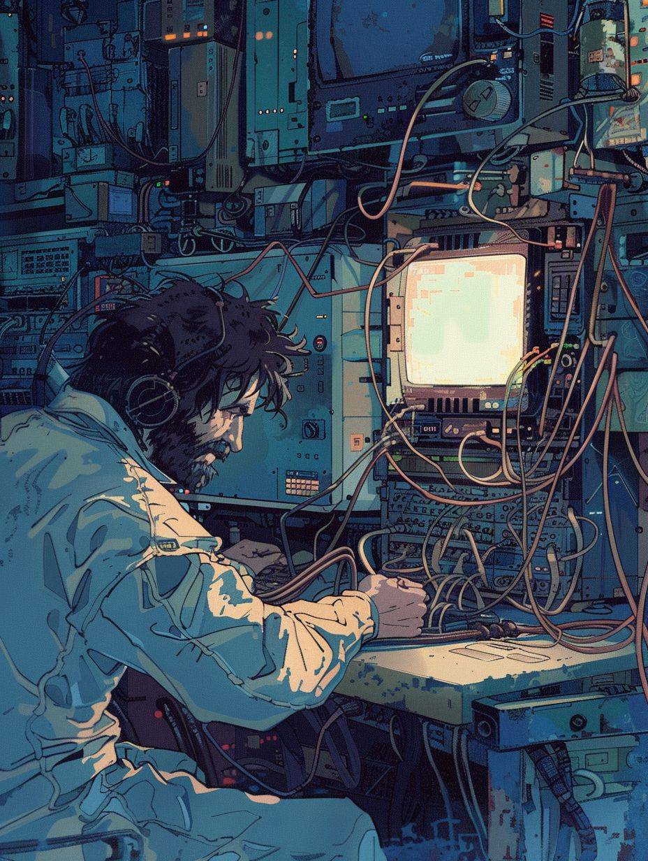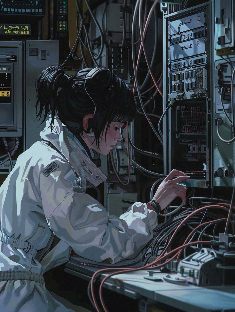 ألكسندر غراهام بيل يصلح الحواسيب، إصلاح الحواسيب، الأنمي، الأنمي الكلاسيكي، أنمي الثمانينيات، أنمي التسعينيات، شبح في الدرع، تجارب سلسلة لين، 4K، قاعدة الثلث، تفاصيل قصوى، رسم تفصيلي، فن متداول على آرت ستيشن، HD، تركيز حاد، مضاء من الخلف، ميزات متناظرة، حبيبات الفيلم