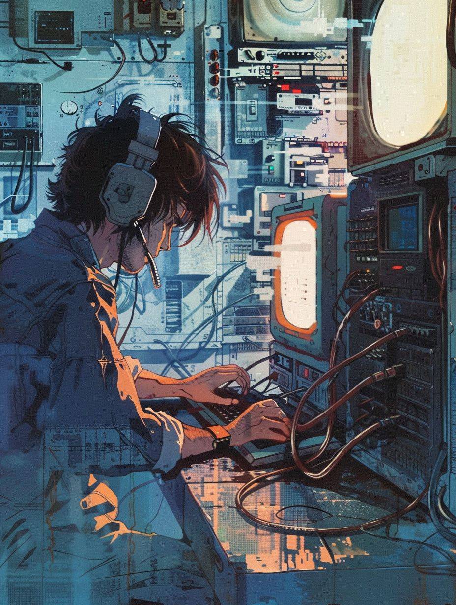 Alexander Graham Bell fixing computers, repairing computers, anime, retro anime, 1980s anime, 1990s anime, ghost in the shell, serial experiments lain, 4k, rule of thirds, extreme detail, detailed drawing, trending artstation, hd, sharp focus, backlit, symmetrical features, film grain --ar 3:4