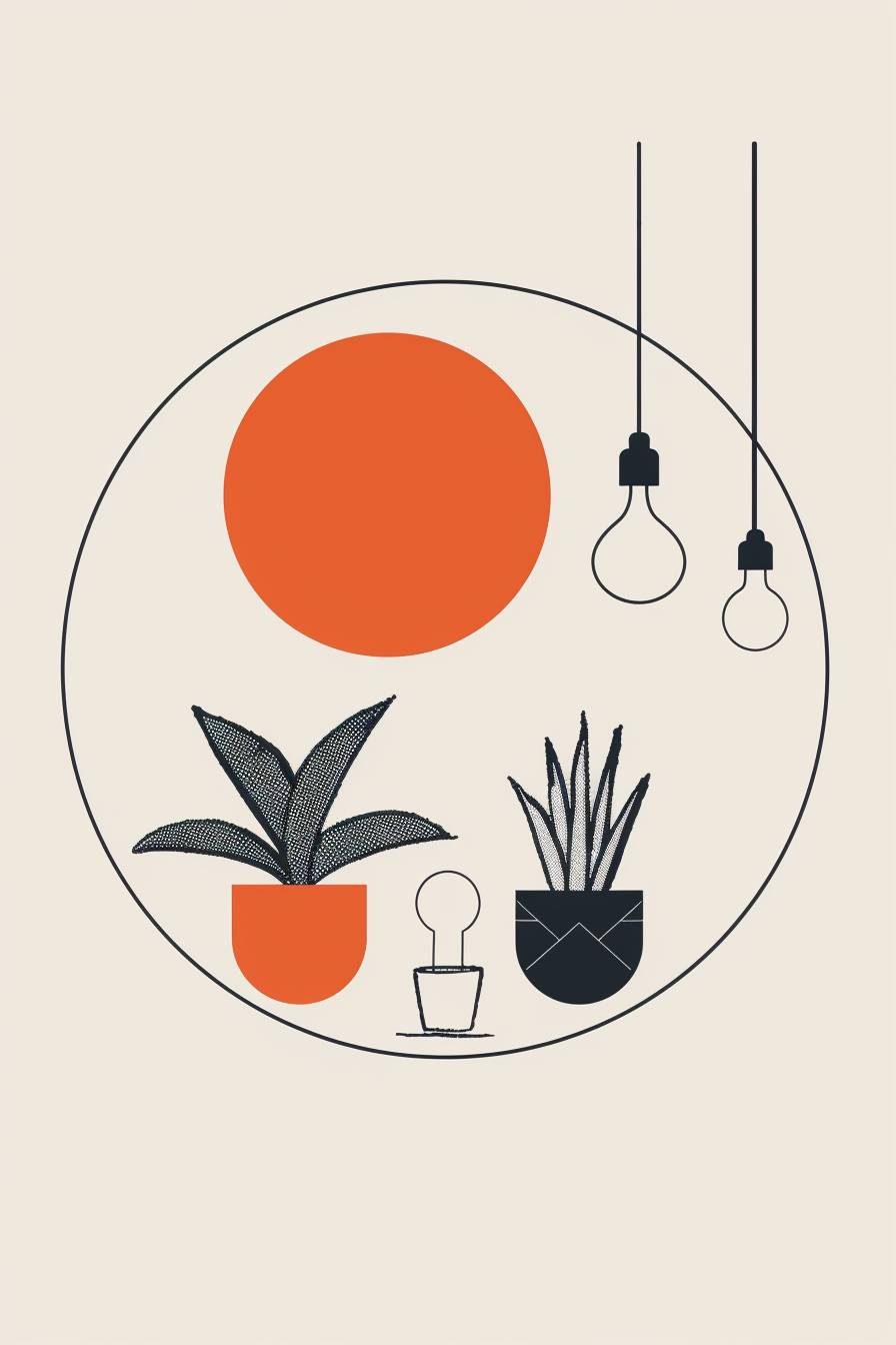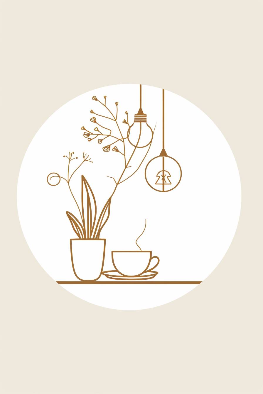 color photo of a simple and clean Instagram profile picture, featuring a circular shape with white background. The icon is composed of minimalistic line drawings depicting elements such as home decor, a cup, a lightbulb, and small plants. The lines are sleek and refined, adding a touch of elegance to the icon. The choice of a circular shape gives the icon a sense of unity and balance. This profile picture is in a minimalist and sophisticated way. --chaos 10 --ar 2:3 --v 6.0
