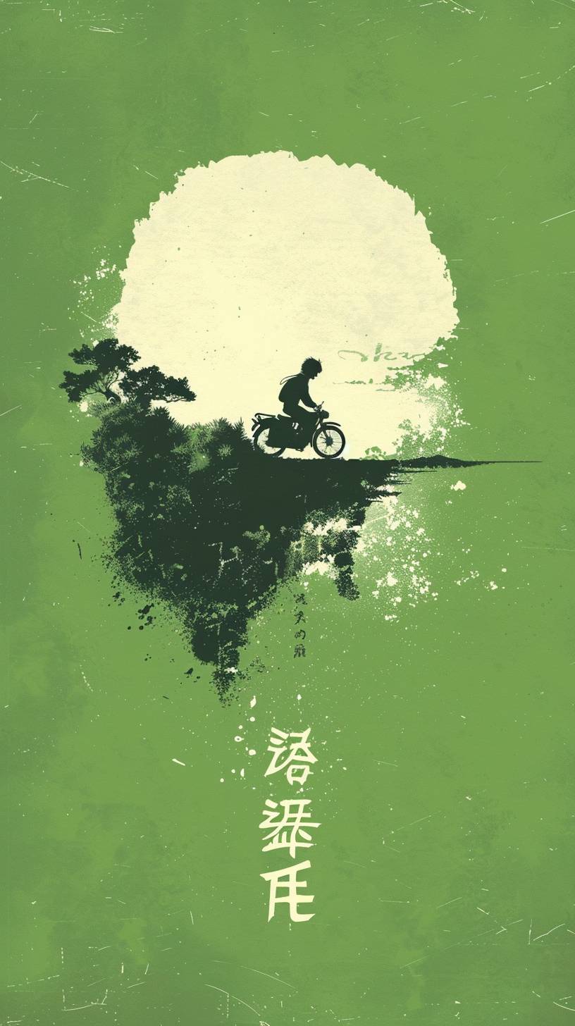 green background, Studio Ghibli movie poster, a boy riding a motorcycle in the distance , minimalistic, silhouette ,no white in the style of anime --ar 9:16 --v 6.0