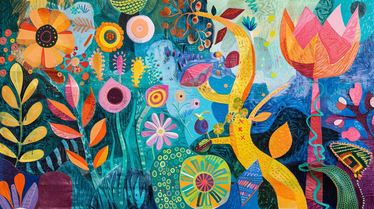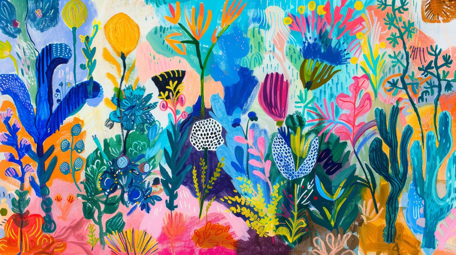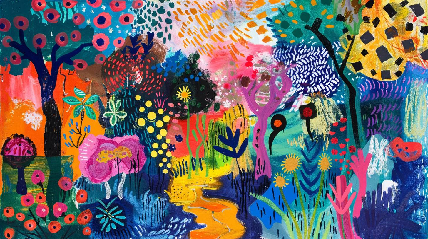 An expressive and colorful depiction of a Majorcan garden inspired by Joan Miró and Joaquim Mir. The garden is filled with vibrant flowers, abstract plant forms, and serene pathways. Use Miró’s symbolic and abstract elements along with Mir’s bold color palette and expressive style to bring the scene to life, capturing the tranquility and vibrancy of Majorca’s gardens --v 6.0 --ar 16:9