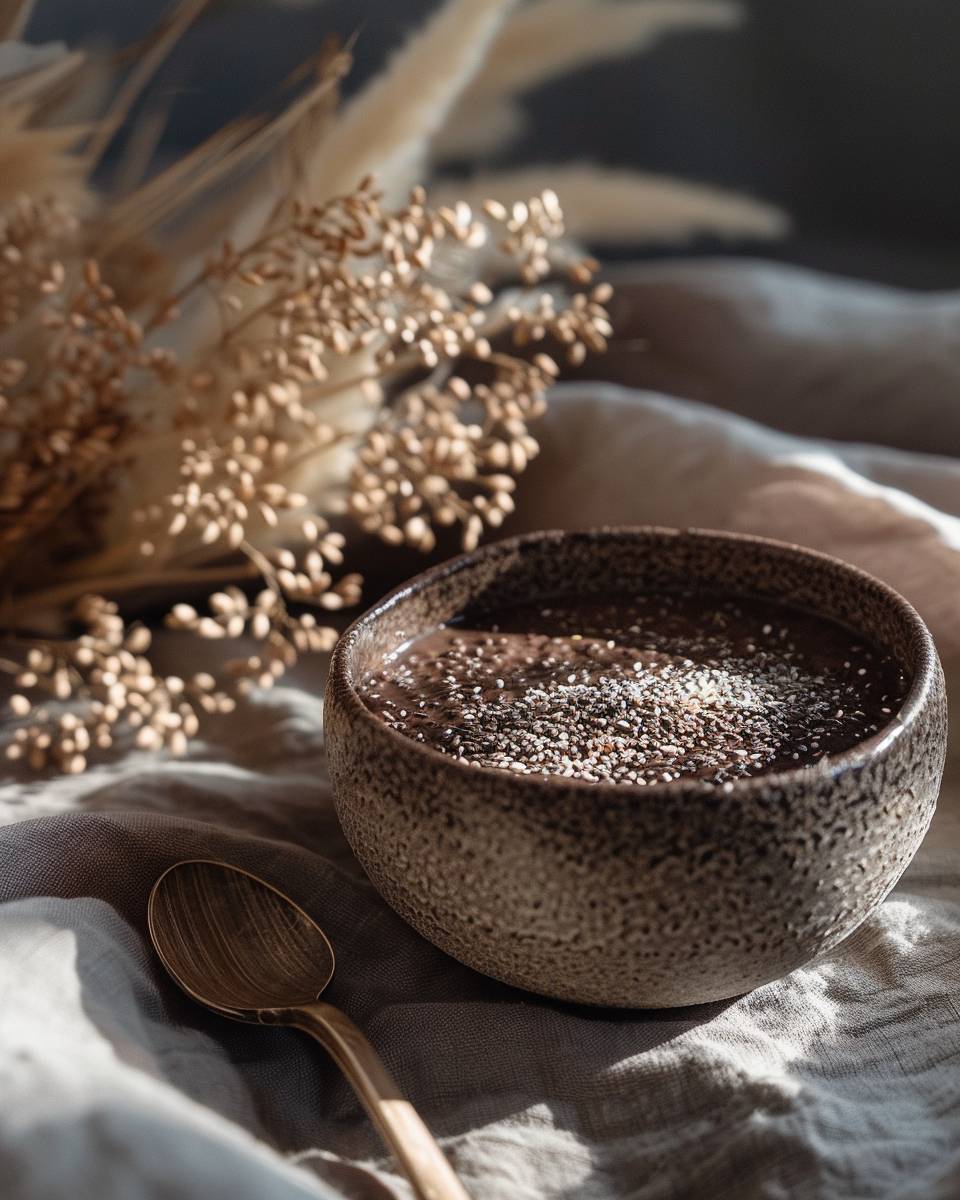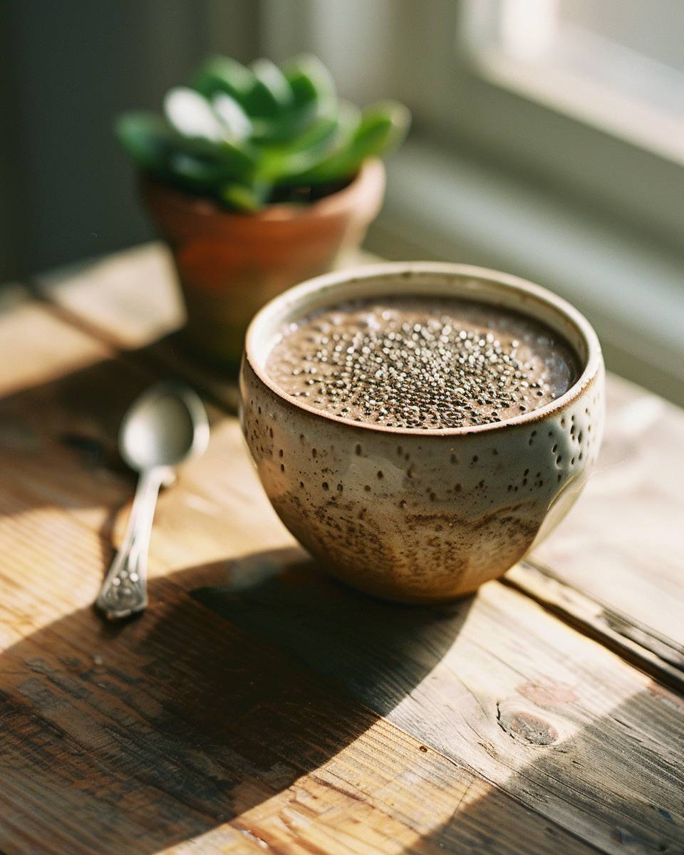 photography food styling, macro close-up shot: Chocolate Chia Pudding on a wooden table, boho decoration, beige colors, morning lighting + shadows, kodak portra 400 --ar 4:5 --style raw --v 6.0