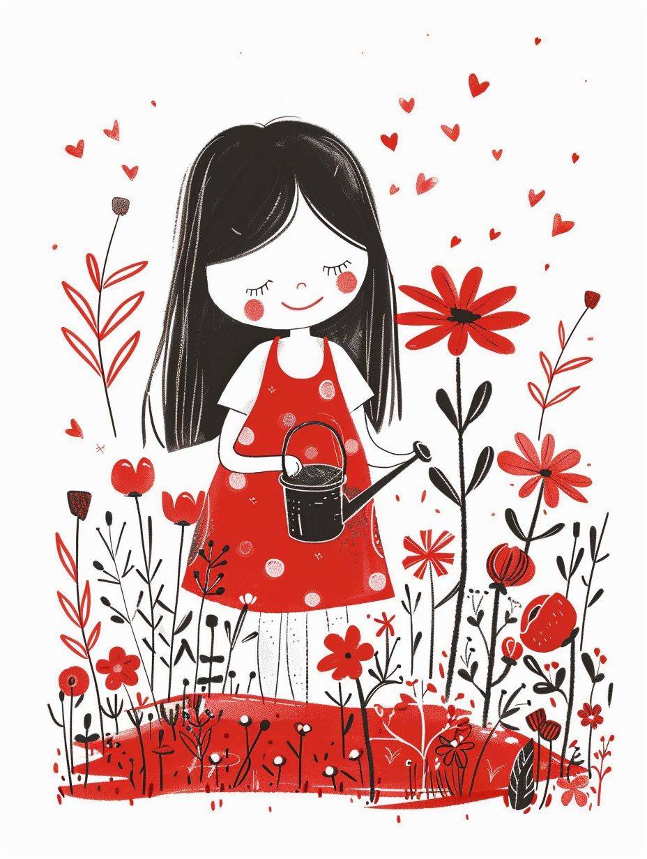 a 5-years old girl in red dress watering a pot of flower,happy and smile,simple line,white blackground,by Gemma Correll, --style raw --ar 3:4 --stylize 250