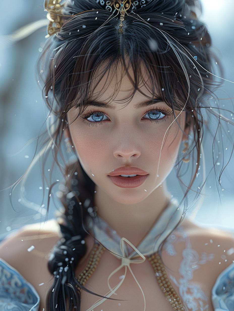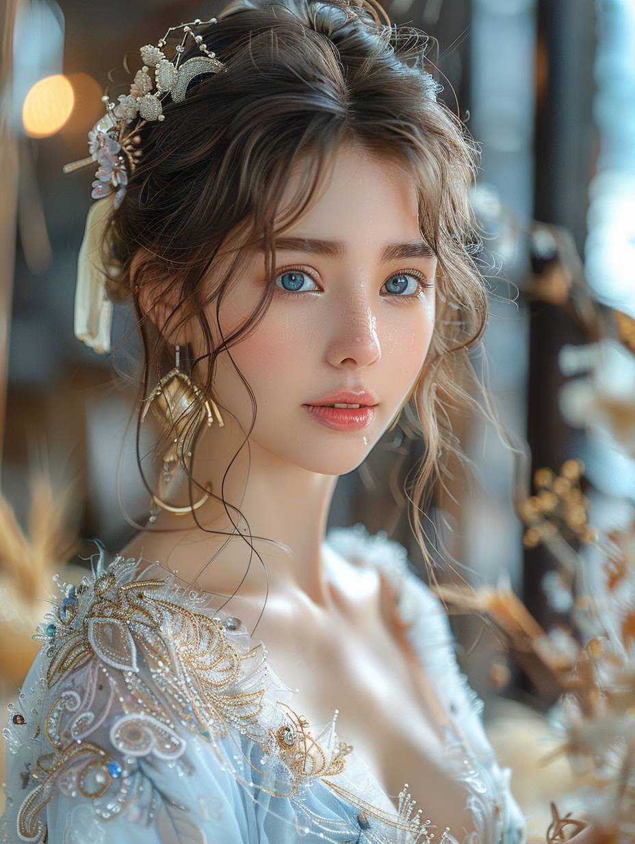 An ultra-realistic digital portrait style, young woman of Japanese nationality, long hair with bangs, voluminous dark brown hair at waist length, decoration with white and yellow ribbon on top of head, shy expression on face, big blue eyes, flushed cheeks, white outfit A blue dress with sleeves and gold ribbons. --chaos 30 --ar 3:4 --stylize 800 --v 6.0