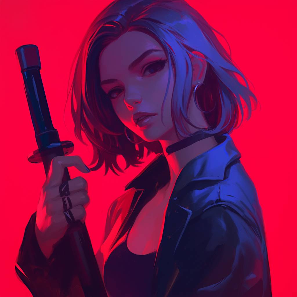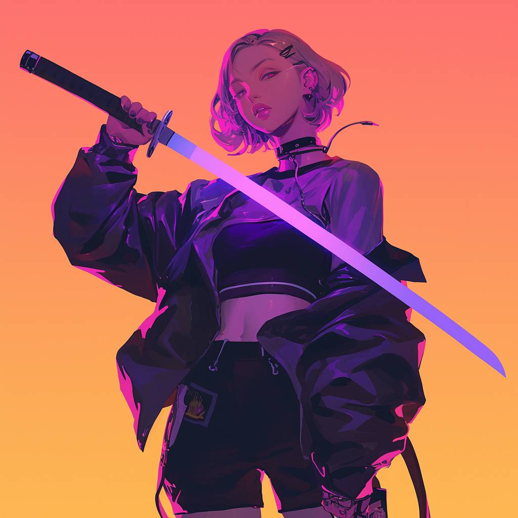 فتاة أنيقة تحمل سيفًا مصنوعًا من مكبر صوت بيدها، عيون مرسومة جيدًا، وملامح مثالية