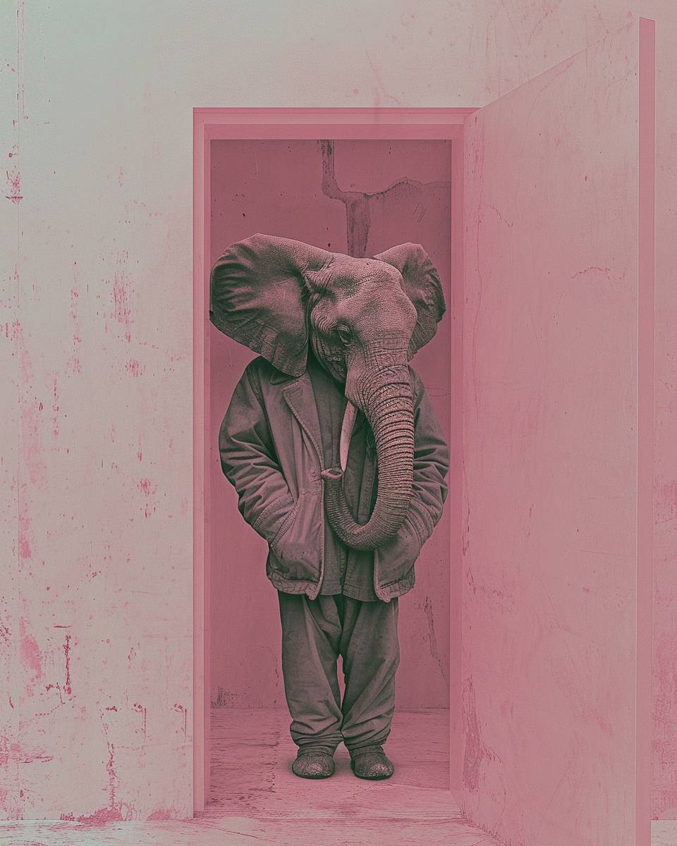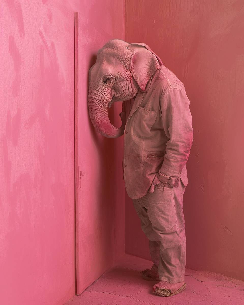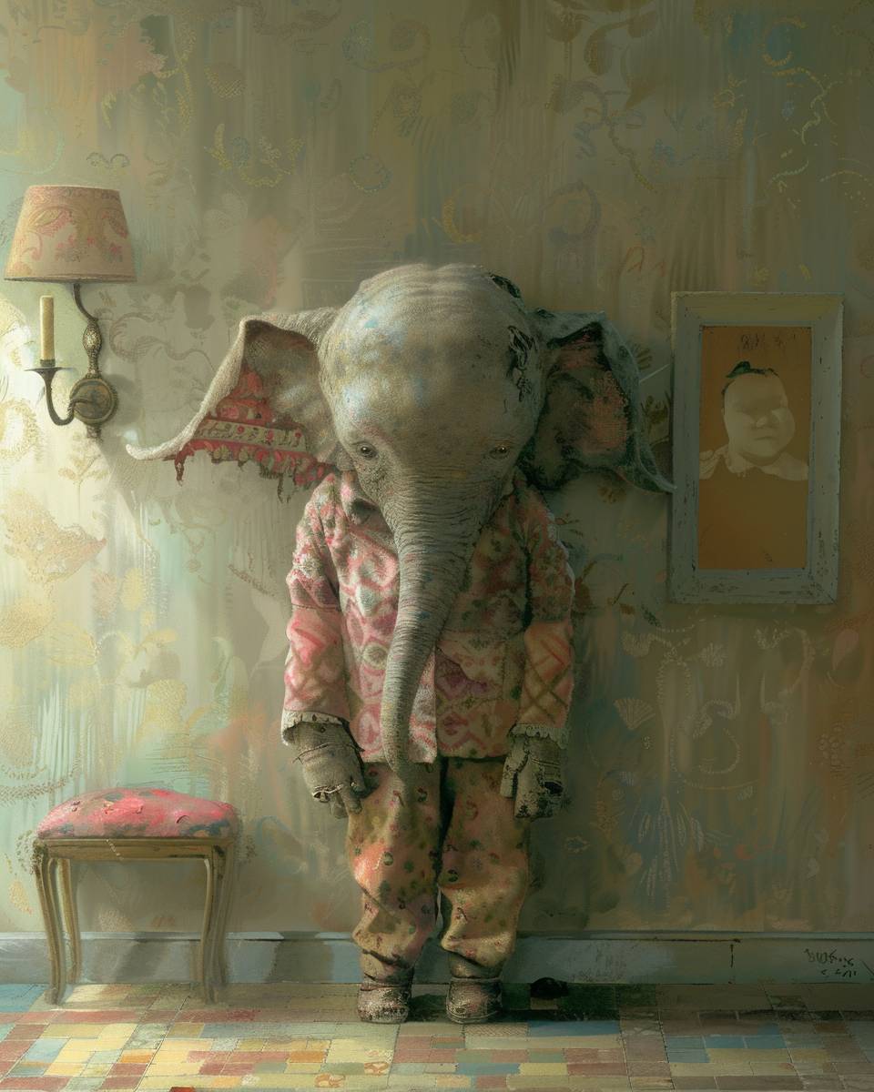 An anthropomorphic elephant in a dirty outfit standing sadly inside a room, shot in a minimalist style with pastel colors, in the style of Henderson and Wes Anderson. --ar 4:5 --v 6.0