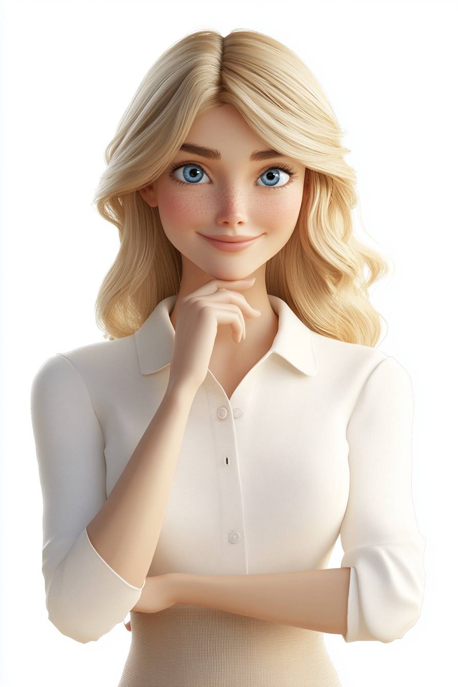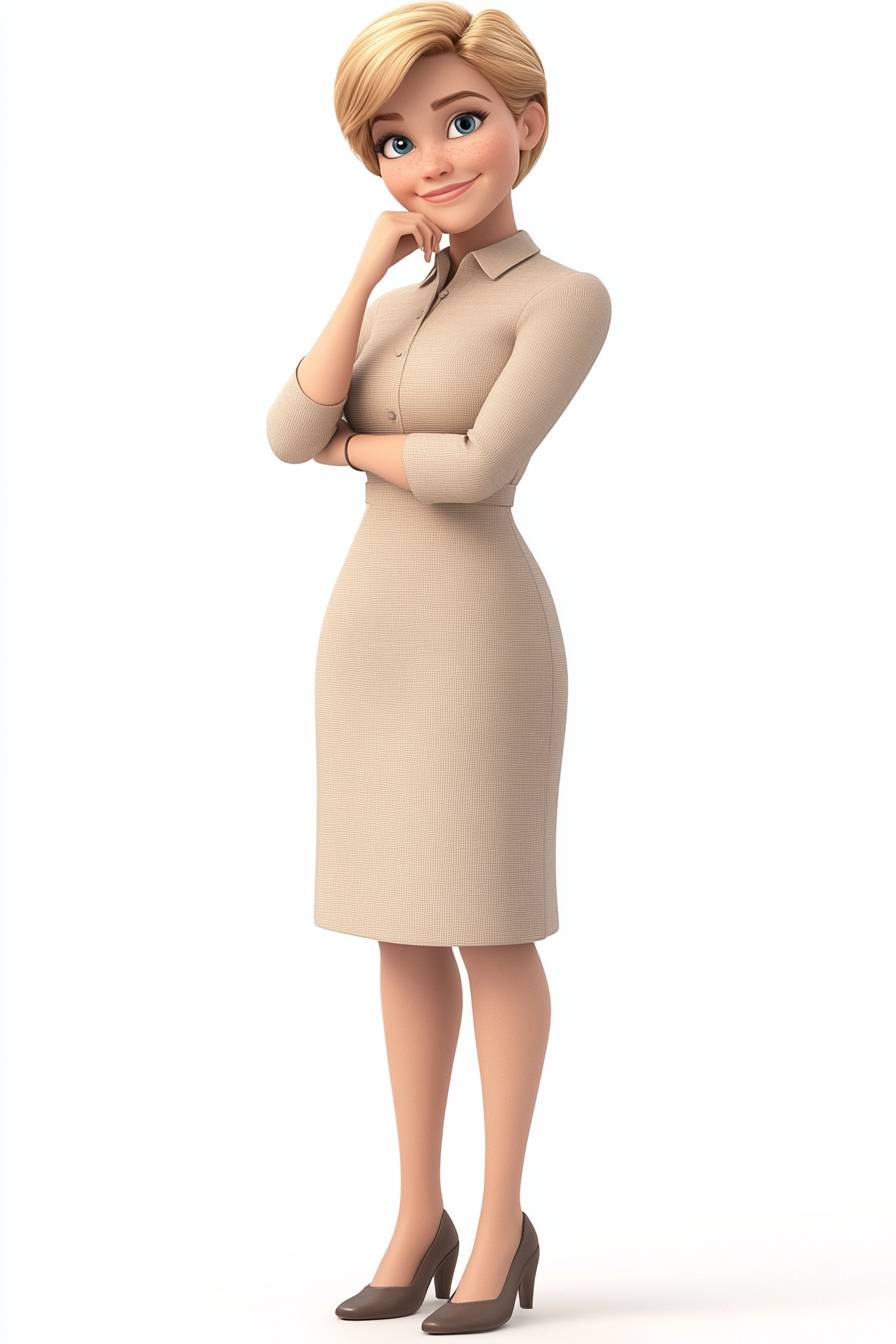 Create a highly detailed, DreamWorks 3D render of a game character on a white background, full body shot. The character is a 35-year-old smiling thoughtful, beautiful young mother touching her chin. Her hair is the hairstyle is neat. Blue eyes. Blond hair. The woman is symmetry, looking into camera. The clothes is business, modest beige dress. White background. Vibrant warm colors. Studio level light. People communication. --ar 2:3 --v 6.1