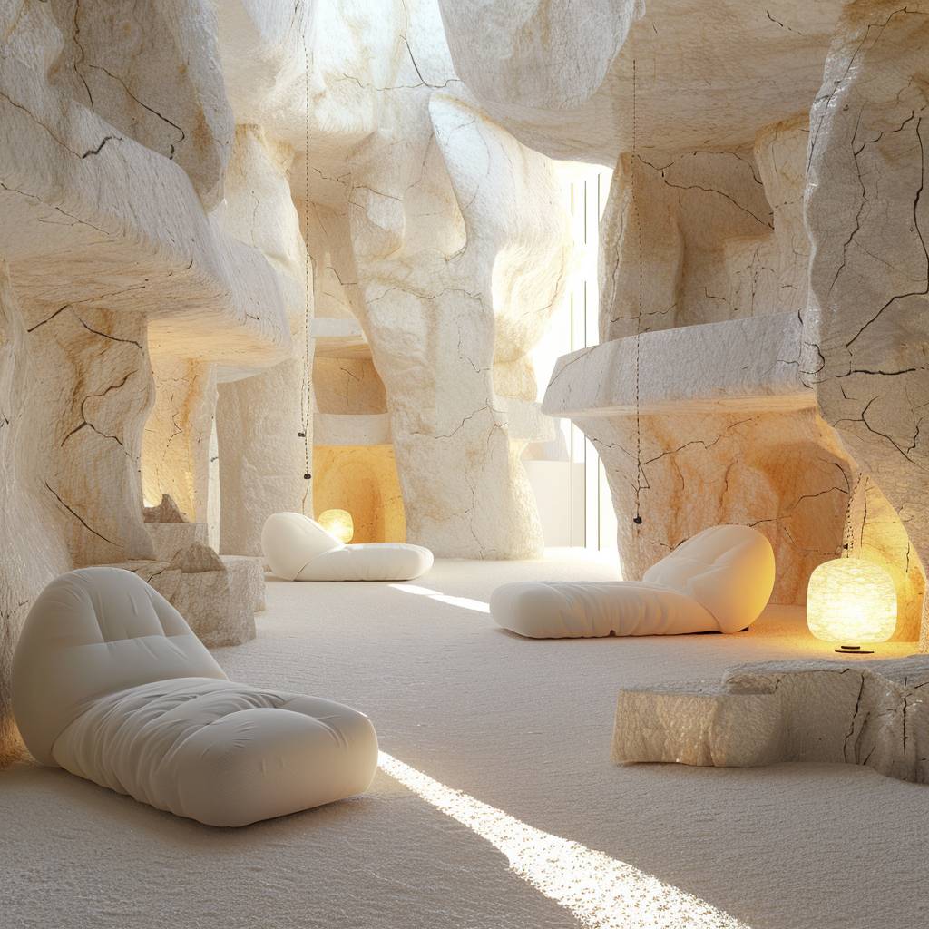 تصميم الأثاث في كهف عصري من الحجر الأبيض الأملس
