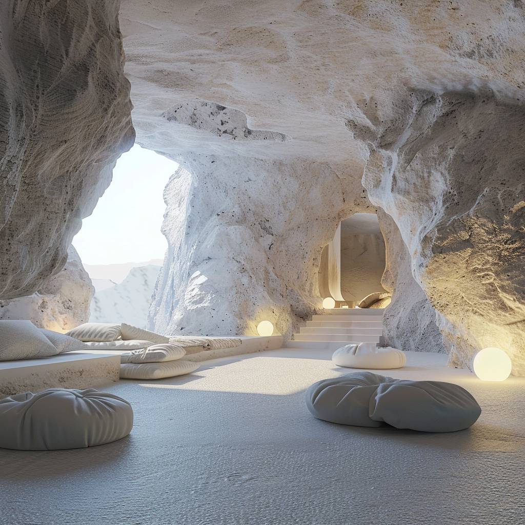 داخل كهف حديث من الحجر الأبيض الأملس، الأثاث، عضوي، تظليل سلس، صحراء، ضوء النهار، ألوان زاهية، هايبر ريلستيك، حديث، سريالي، أضواء، ستة وخمسة، عمارة حديثة، تفاصيل عالية، عرض أوكتان، بيهانس