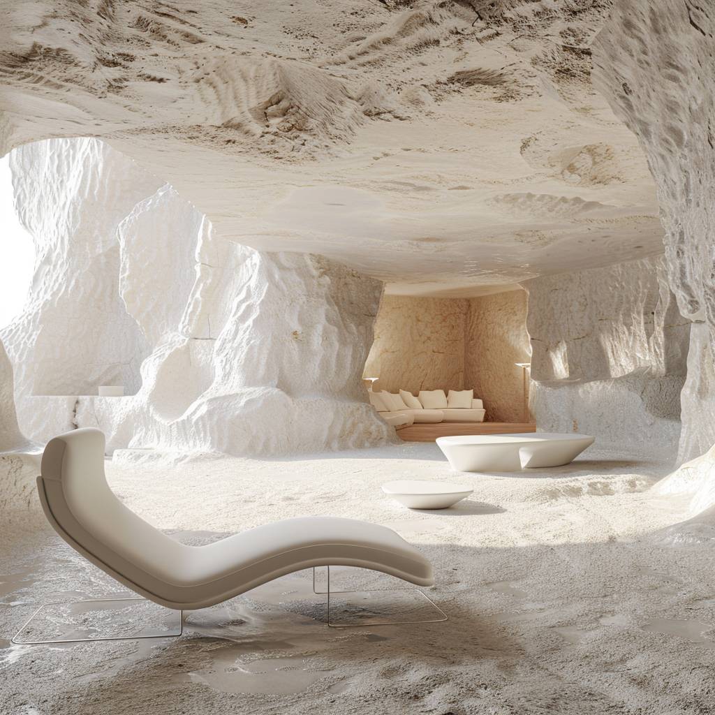 inside a modern white smooth stone cave, furniture, organic, smooth shading, desert, daylight, bright colors, hyper realistic, modern, surreal, lights, six n five, modern architecture, high detailed, octane render, behance --v 6.0