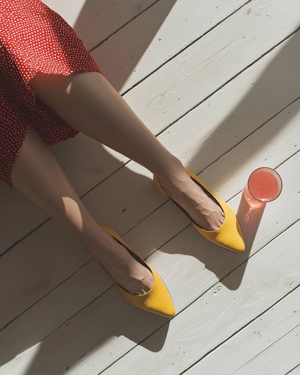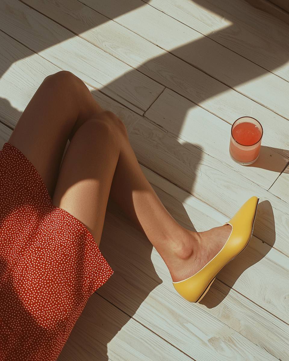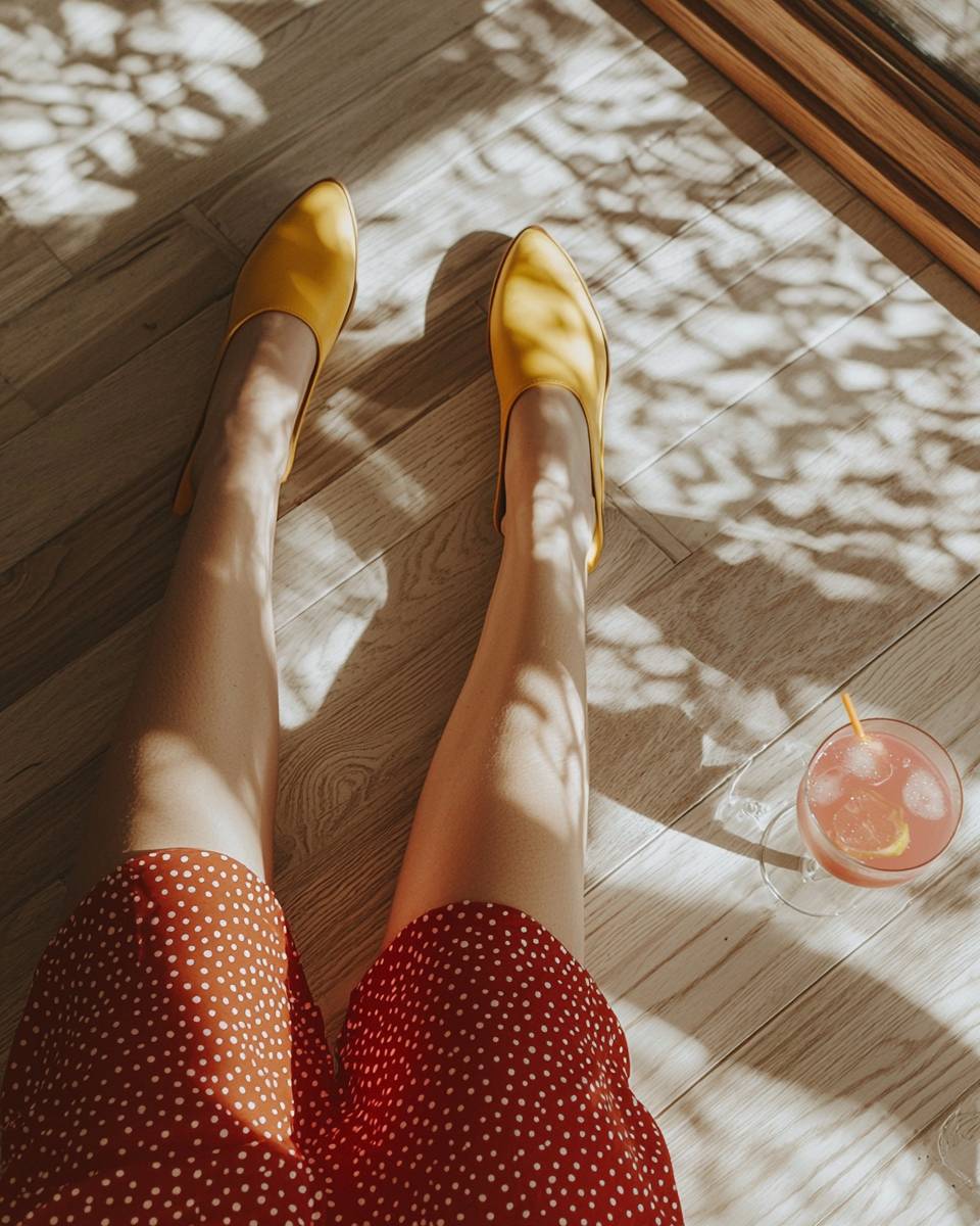 A photo of an Armenian woman's hairy legs in a seated position on the floor, wearing italian mustard yellow shoes. She is dressed in an red polka dot dress. Next to her legs is a glass of pink drink on a white wooden floor. The sunlight casts shadows, creating a striking contrast and highlighting the textures of the floor and her non-perfect skin. Shot from above with a minimalist aesthetic, soft light, and neutral colors. --ar 51:64 --quality 2 --v 6.1