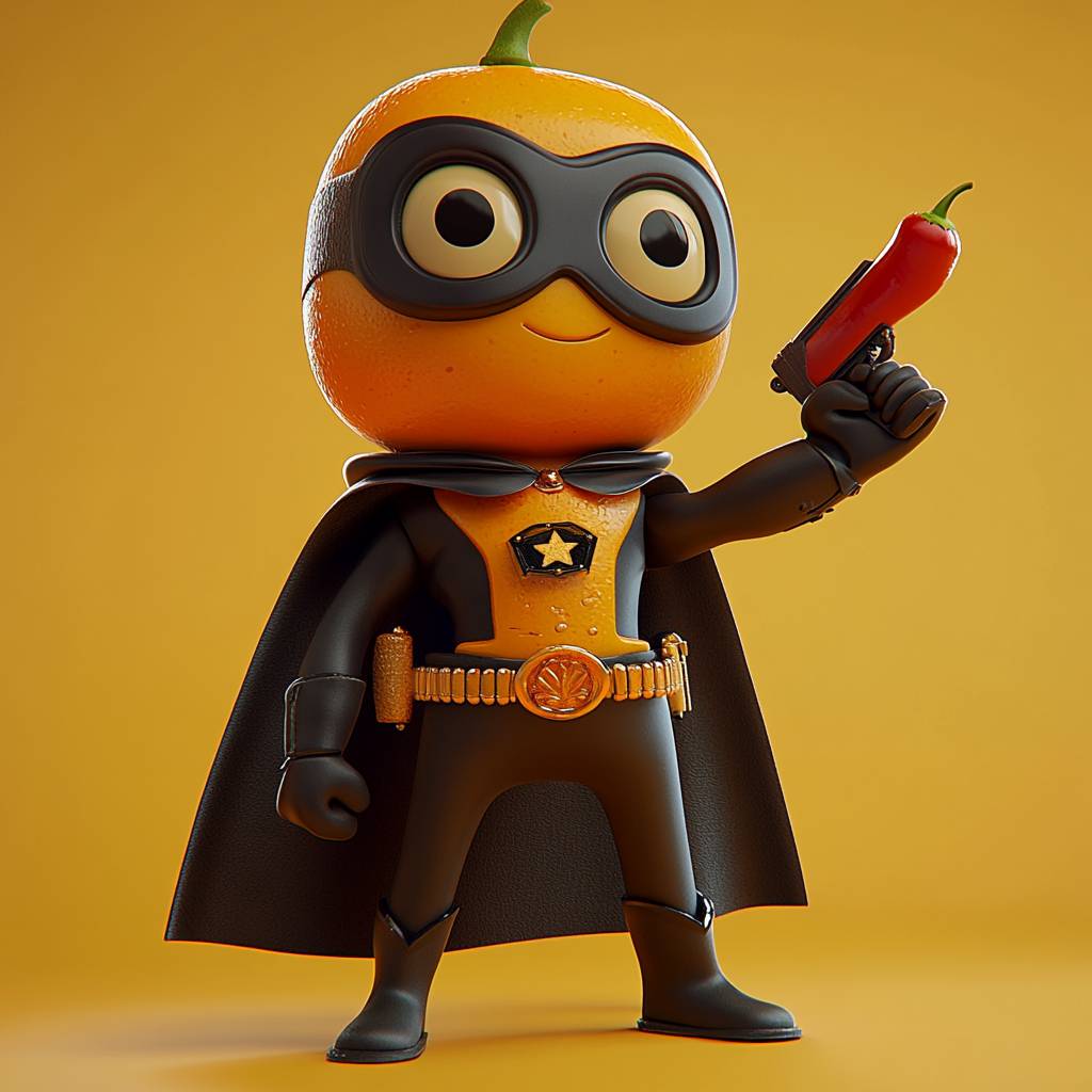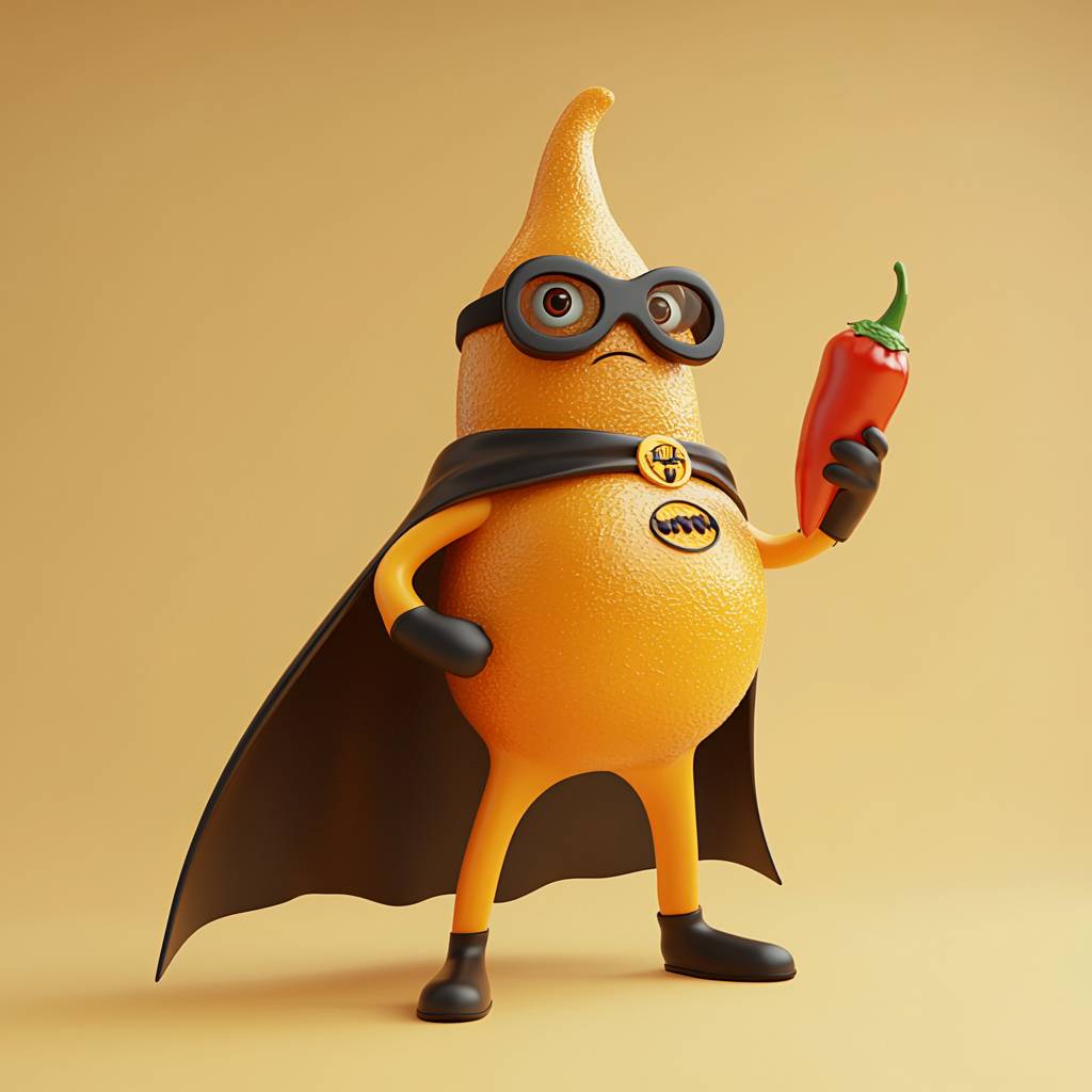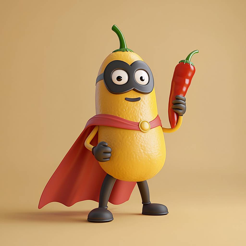 a cartoon hero character, Toy Story visual style. a chilli coated peanut hero, wearing a long cape and a hero mask, holding a red pepper like a gun. solid simple background, 3D animation style. --ar 1:1 --v 6.1
