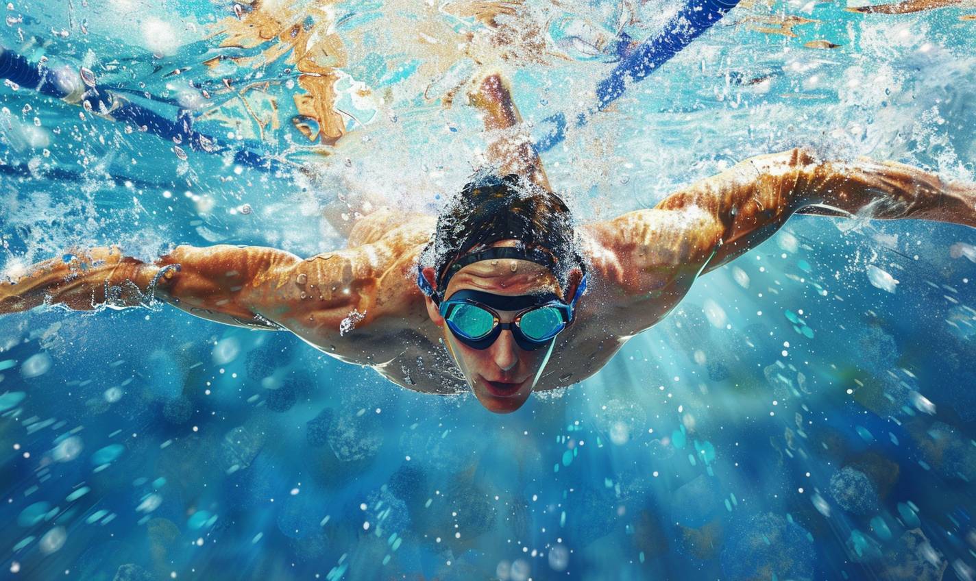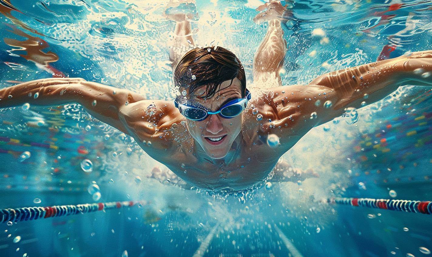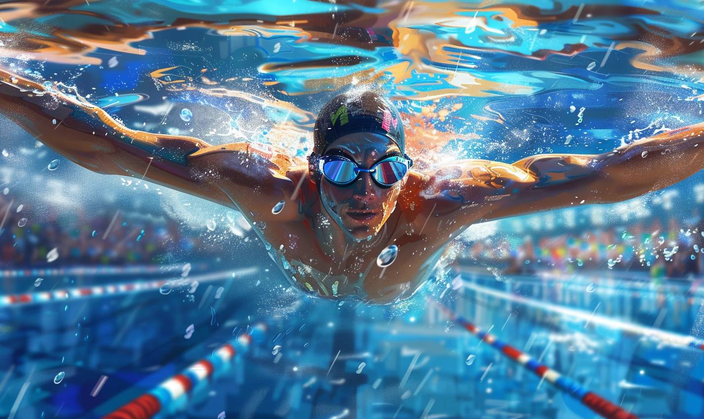 سباح أولمبي رجالي يسبح بأسلوب الفراشة نحو خط النهاية. يرتدي نظارات السباحة، وجسده تحت الماء بينما يطفو رأسه فوق سطح الماء. يتلألأ جسده الرياضي المشدود بقطرات الماء، بينما حمام السباحة الأولمبي مليء بالمشجعين المتحمسين والمسؤولين الذين يرتدون ملابس السباحة الرسمية وزي الأولمبياد. تم تصويره بأسلوب ديناميكي بألوان زاهية وتفاصيل حادة لالتقاط قوة وجمال اللحظة الأولمبية.