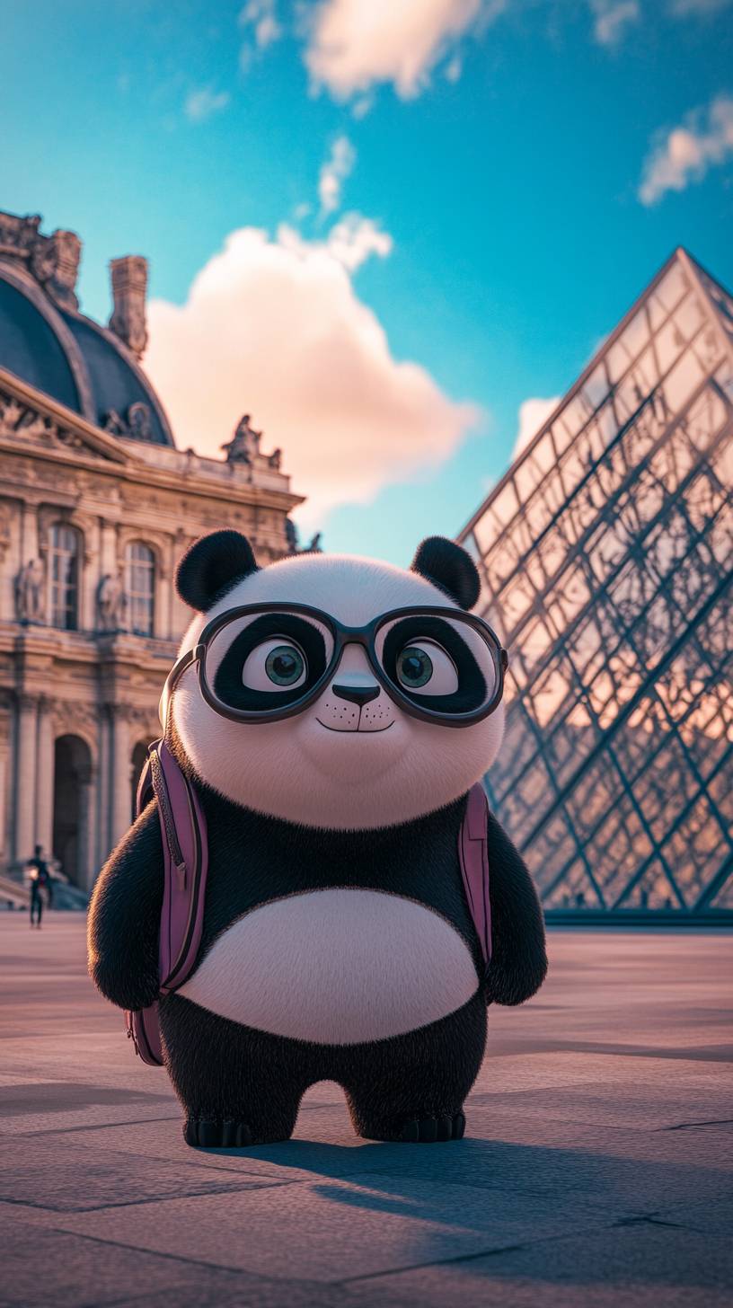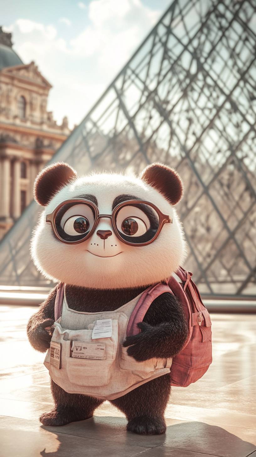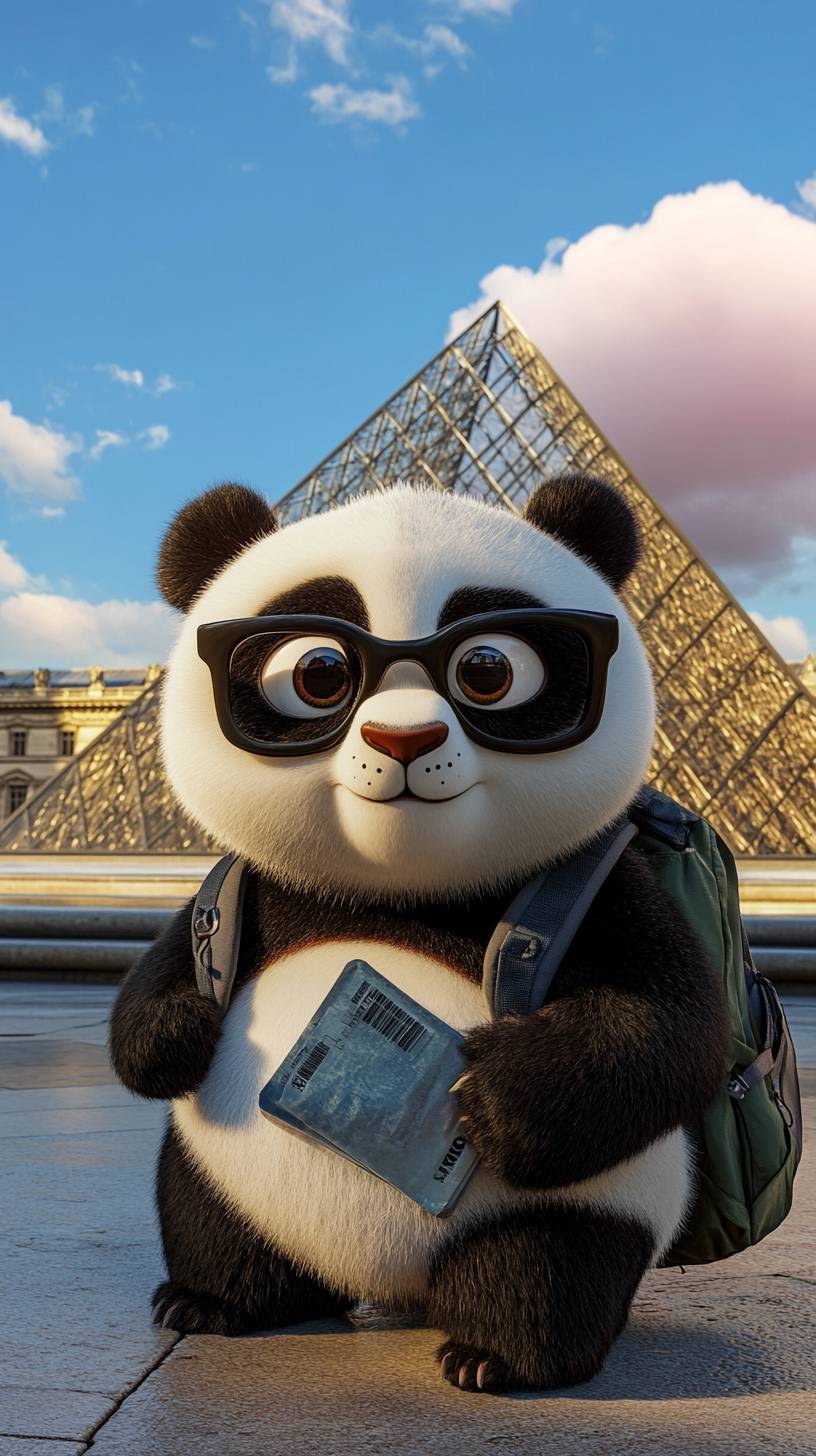 Giant panda wearing glasses, Louvre, visit, Pixar, cartoon, pale pink cloud, backpack, ticket, 8K,HDR --ar 9:16 --stylize 50 --v 6.1