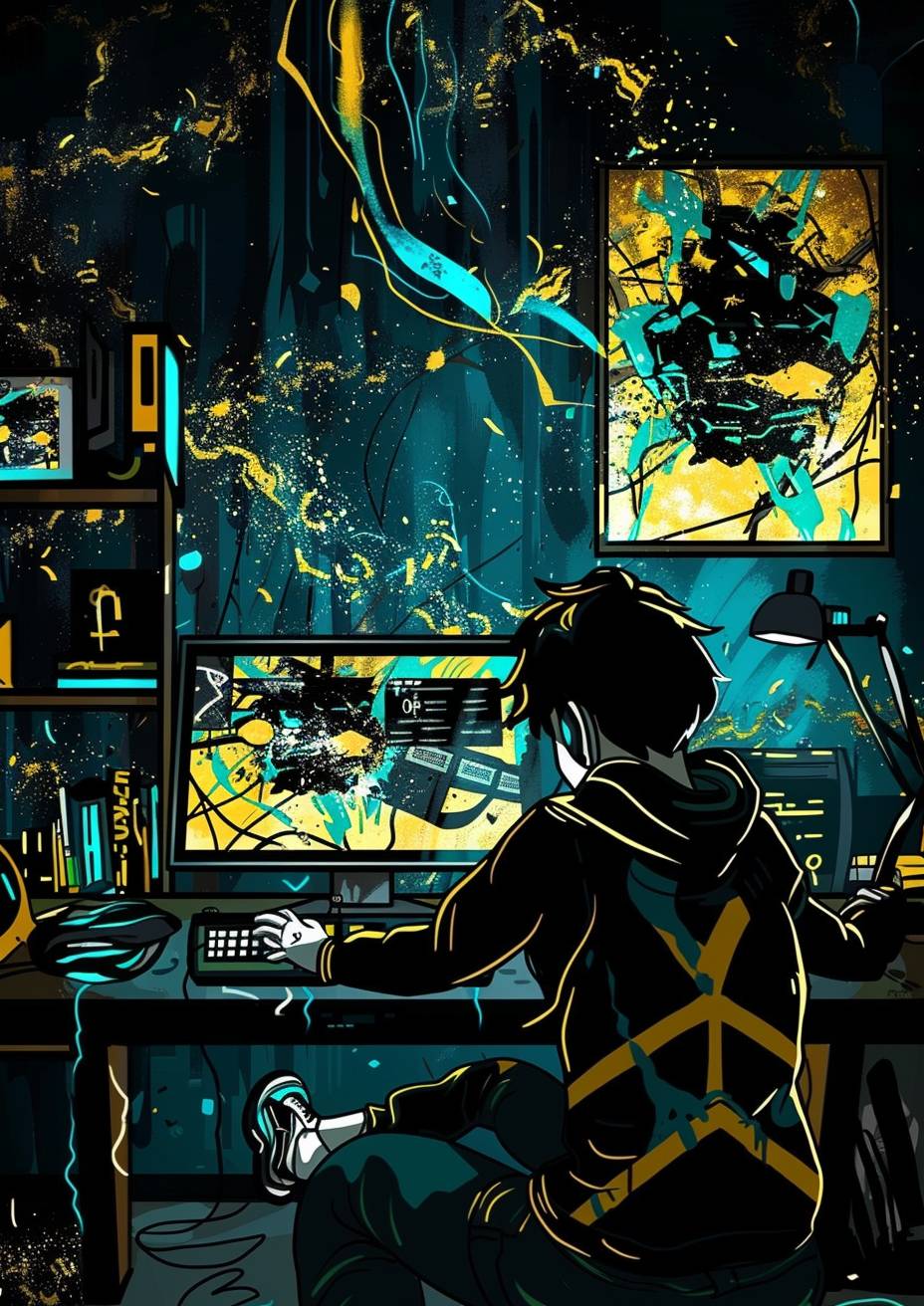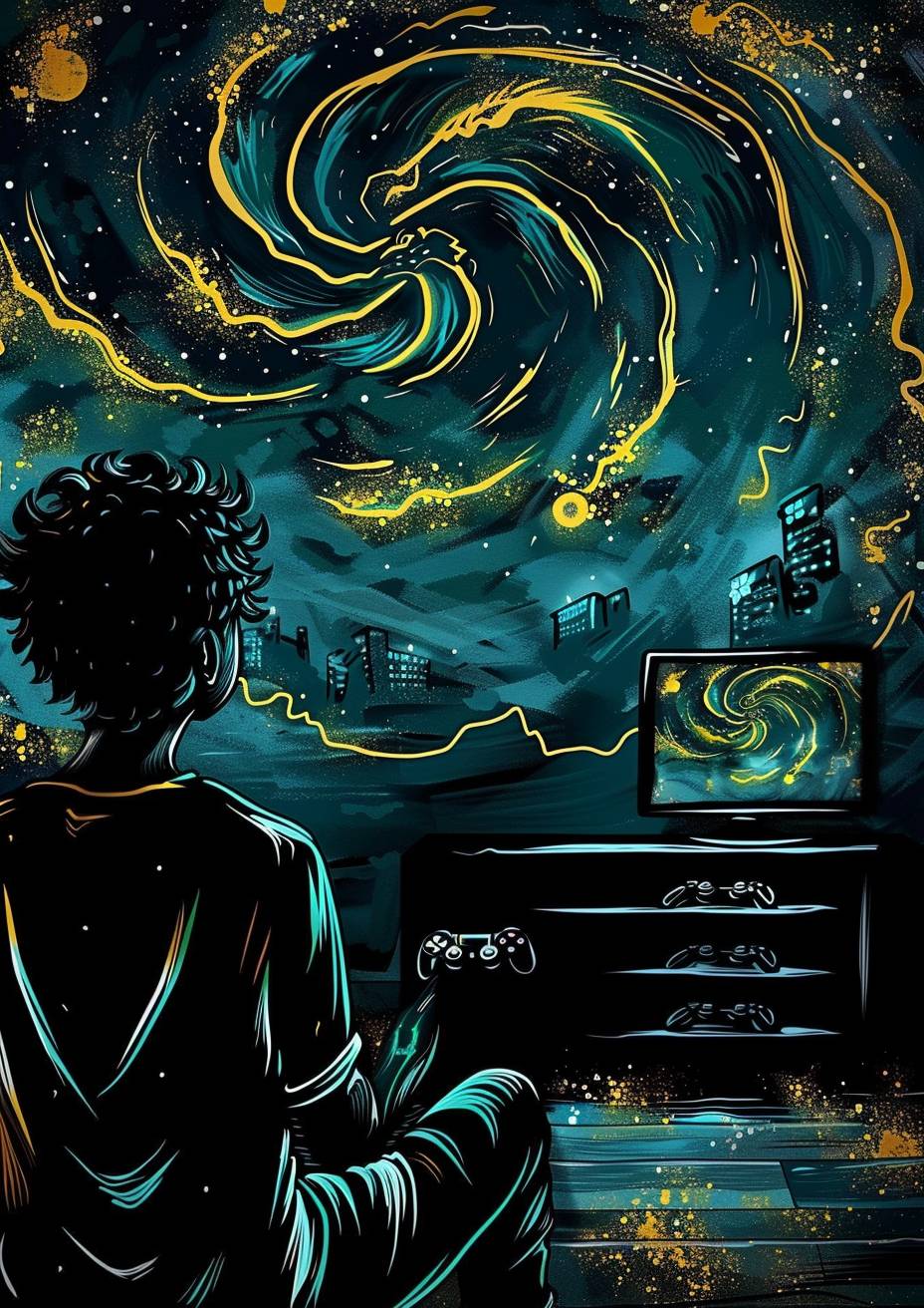 شينجي يلعب ألعاب الفيديو في غرفة مظلمة.