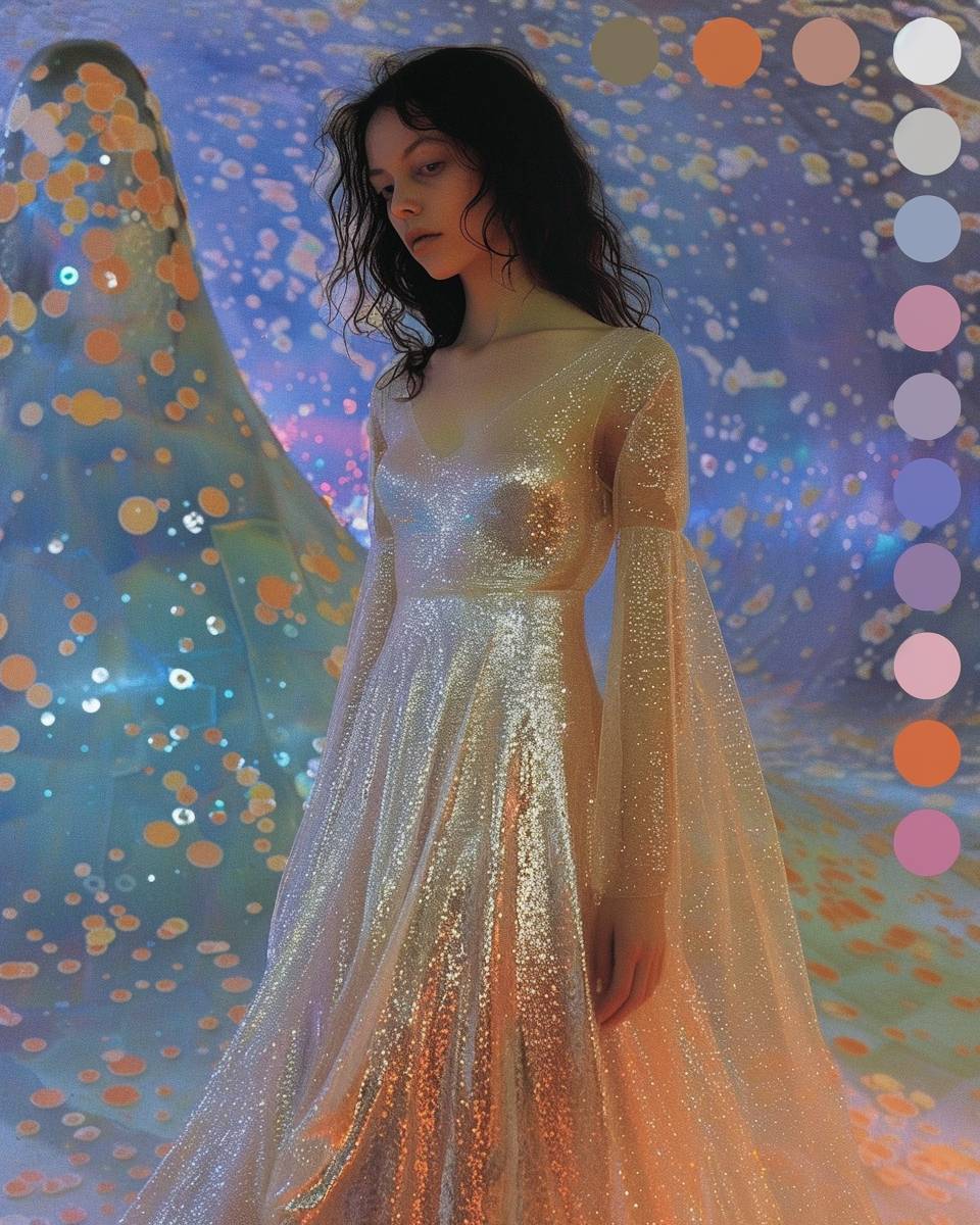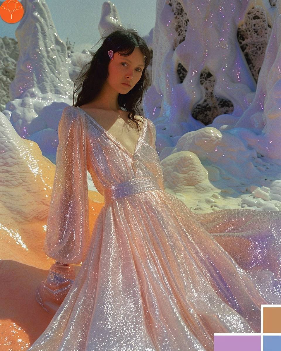 صورة لامرأة بنيّة جميلة ترتدي فستانًا لامعًا في منظر طبيعي سريالي وإثيري. تتضمن لوحة الألوان البرتقالي الفاتح، لون المرجان، الوردي الناعم، البرتقالي النابض بالحياة، الأزرق البارد، والأرجواني اللافندر.