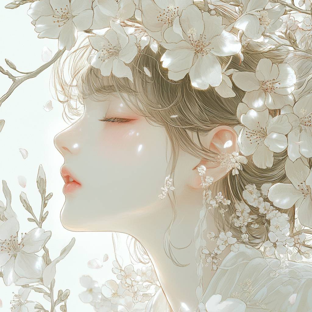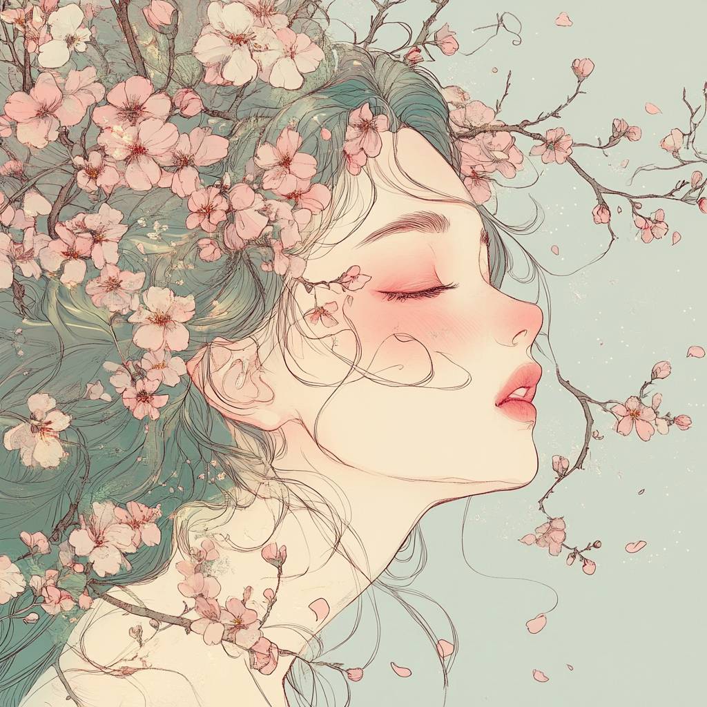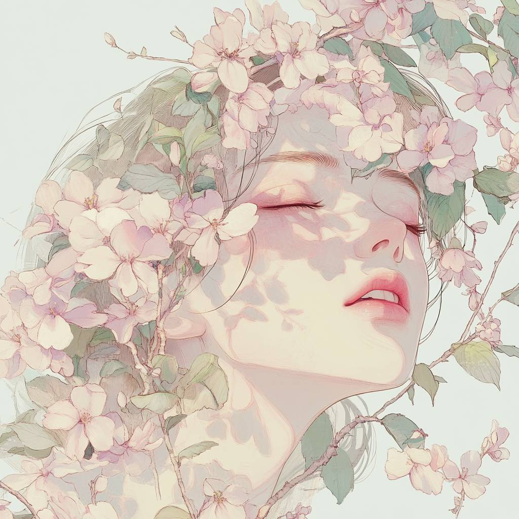 Delicate, ethereal character designs with intricate line work, soft color palettes, and a focus on expressive facial features and body language. Compositions feature natural elements like cherry blossoms and lush foliage, creating a dreamlike, romantic atmosphere. --v 6.1