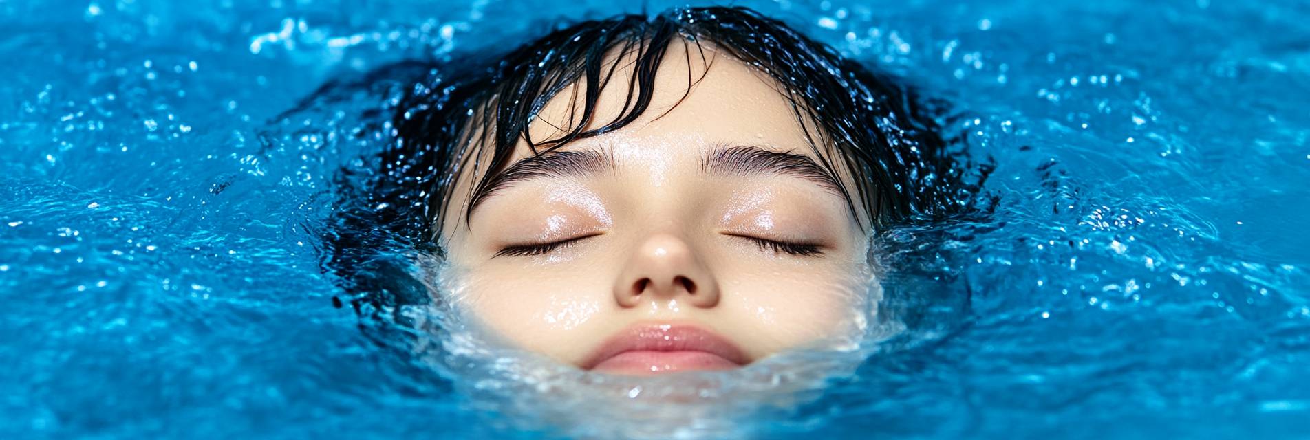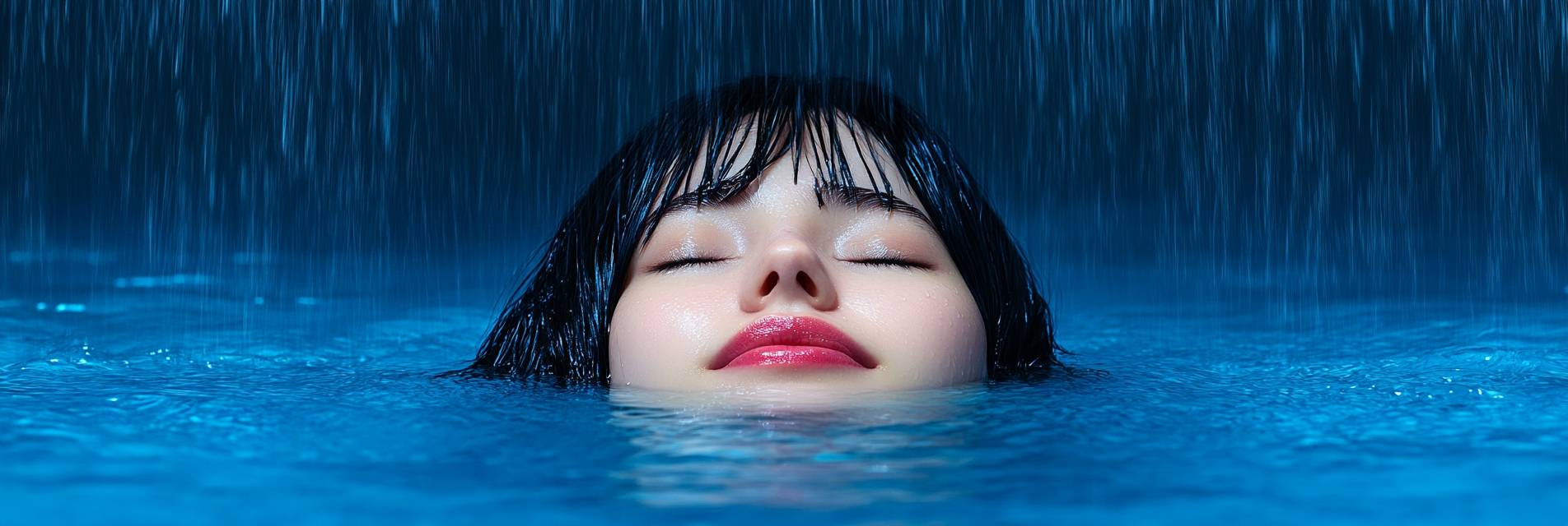 وجه جميل يطفو في ماء نقي تحت مطر رقيق.