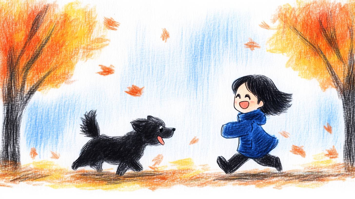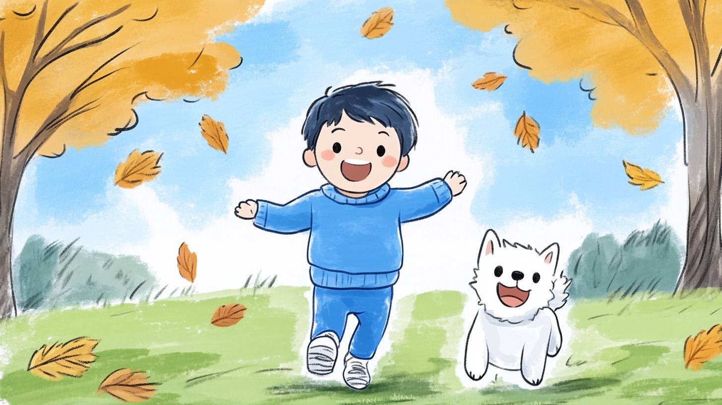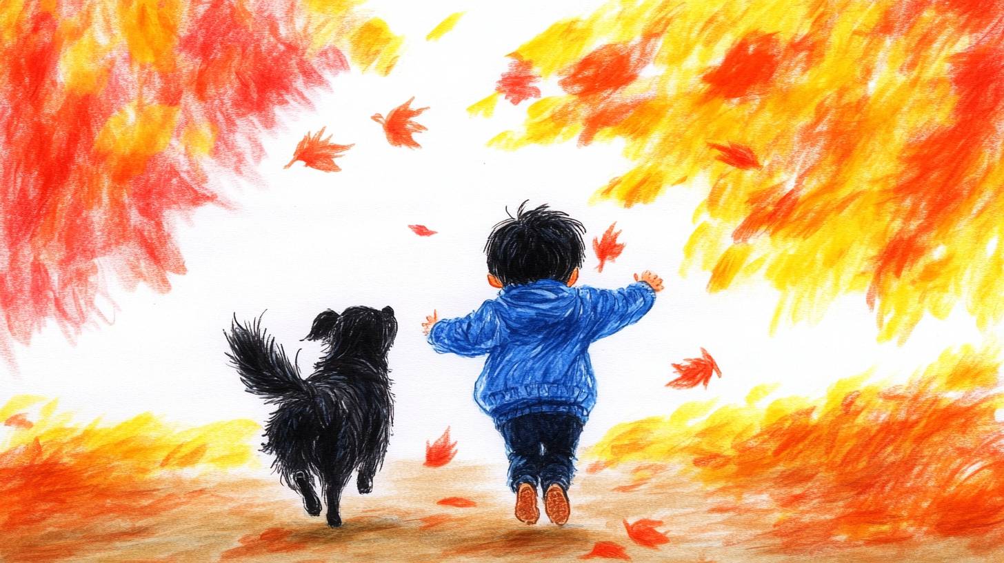 A colorful autumn scene with leaves falling gently from the trees, a child running through the park, laughing as they chase after their playful dog --chaos 20 --ar 16:9 --sref 794311140 --personalize w8lrxuz --stylize 500 --v 6.1