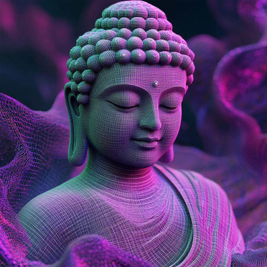 تمثال بوذا الهادئ بأسلوب HoloEtherealDigitalGrids، على قماش من اللون اللافندر والأخضر المريمية، محاطًا بكسرات نيون.